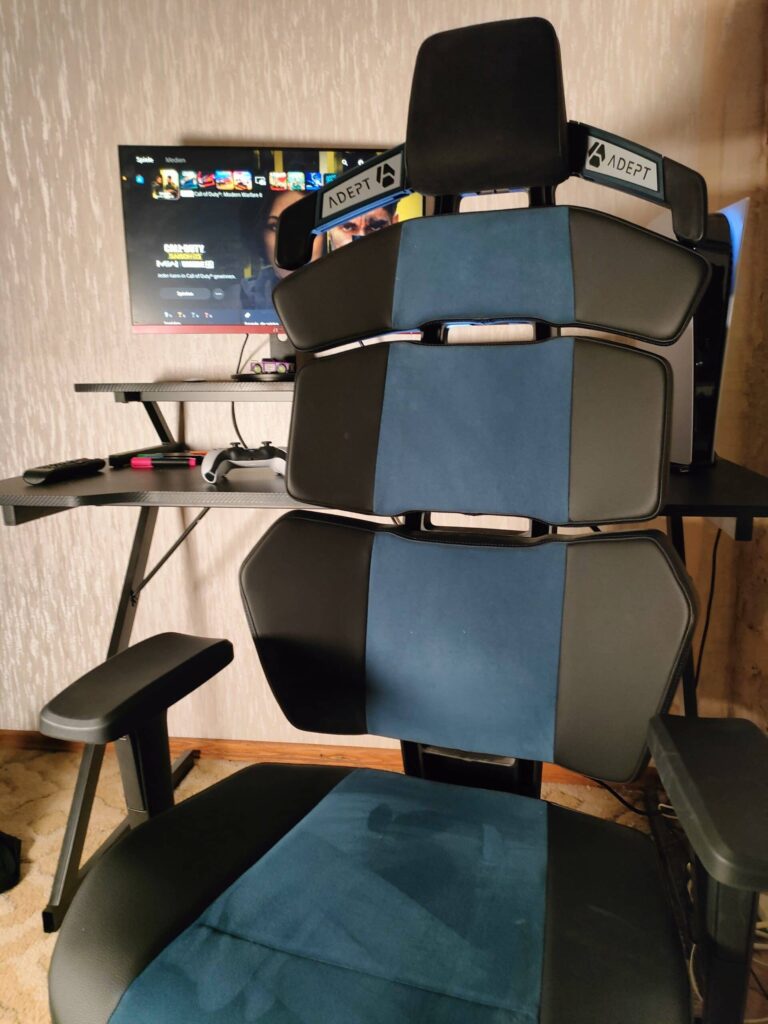 Als mich der Adept Zuhause per Post erreicht hatte, war ich schon voller Vorfreude, konnte ich ihn schon einmal auf der Gamescom 2022 kurz ausprobieren. Beim Auspacken gleich die erste Überraschung, der komplette Karton ist nur mit Pappe zum Schutz des Stuhles „ausgefüllt“, unnötige Folie oder Plastik suchte ich vergebens. Nach kurzer Recherche wurde mir auch der Grund klar, Adept wirbt mit Nachhaltigkeit, wie sie mir mit der Verpackung bewiesen haben. In gut 2 Minuten hatte ich dann auch alles ausgepackt, wobei mich die nächste Verwunderung traf. Kein Werkzeug, keine Schrauben? Nein, der Stuhl ist in 3 Minuten aufgebaut, ohne eine einzige Schraube festzuziehen. Im Video über diesem Absatz könnt ihr sehen wie einfach der Aufbau ist. Somit hat Adept es geschafft mich in den ersten 10 Minuten nach Einzug mehrmals positiv zu überraschen.