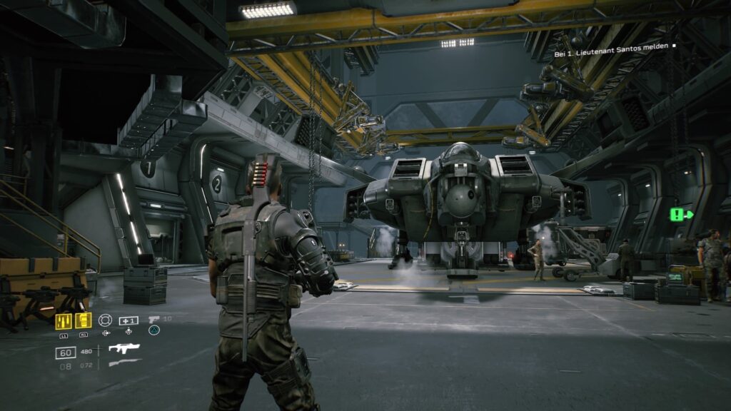 Wie ihr euch bereits denken könnt fungiert die UAS Endeavor nicht nur als Einstieg in das Spiel Geschehen sondern auch als Basis. Hier finden sich NPC’s mit denen ihr jederzeit ins Gespräch kommen könnt, einen Shop in dem ihr kaufen könnt was das Herz begehrt und der Geldbeutel hergibt. Der Hangar dient auch als Hub-Areal, in welchem wir unsere Mitspieler sammeln, somit ist dieser so zu sagen Dreh- und Angelpunkt des Spiels. Ist alles vorbereitet, eure Mitspieler bereit, kann es auch schon losgehen.