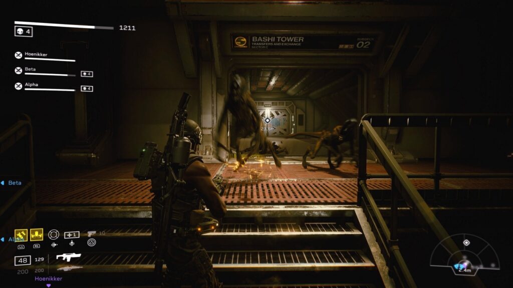 Aliens: Fireteam Elite ist mit der Unreal Engine 4 ausgestattet, was von Haus aus eine solide Optik mit sich bringt, jedoch wäre da definitiv noch mehr drin gewesen. Zudem durften wir immer wieder eine Ruckler feststellen egal ob PlayStation 4 oder 5 Version, auch der ein oder andere Angreifer rannte durch Wände um nur eines der zahlreichen Beispiele zu nennen. Jedoch hat man nur bedingt Zeit auf diese Bugs zu achten, da ja schon die nächsten Aliens ums Eck gerannt kommen. Die Musikalische Untermalung ist auch eher befremdlich, hier ist von sphärischen Melodien bis hin zu wildem Getrommel alles dabei. Dies mag für den ein oder anderen störend wirken oder wie in unserem Fall auf Dauer nerven. Dies mag „jammern“ auf hohem Niveau sein, jedoch möchten wir euch diese Punkte nicht vorenthalten.