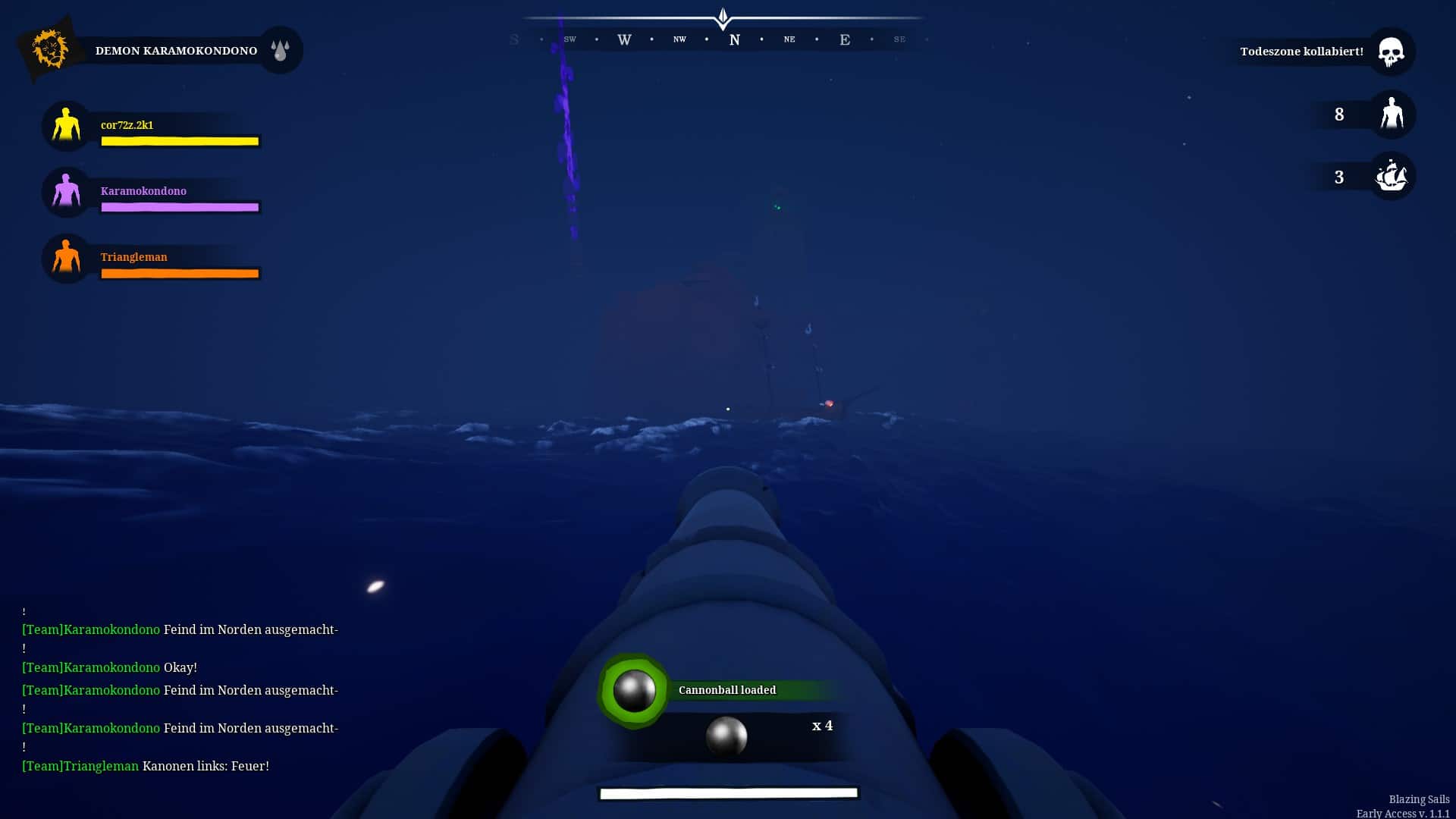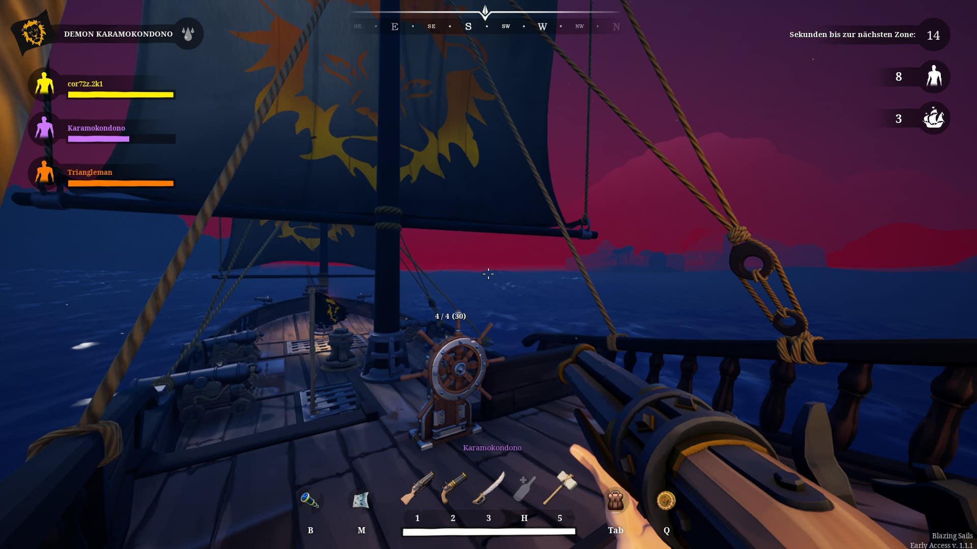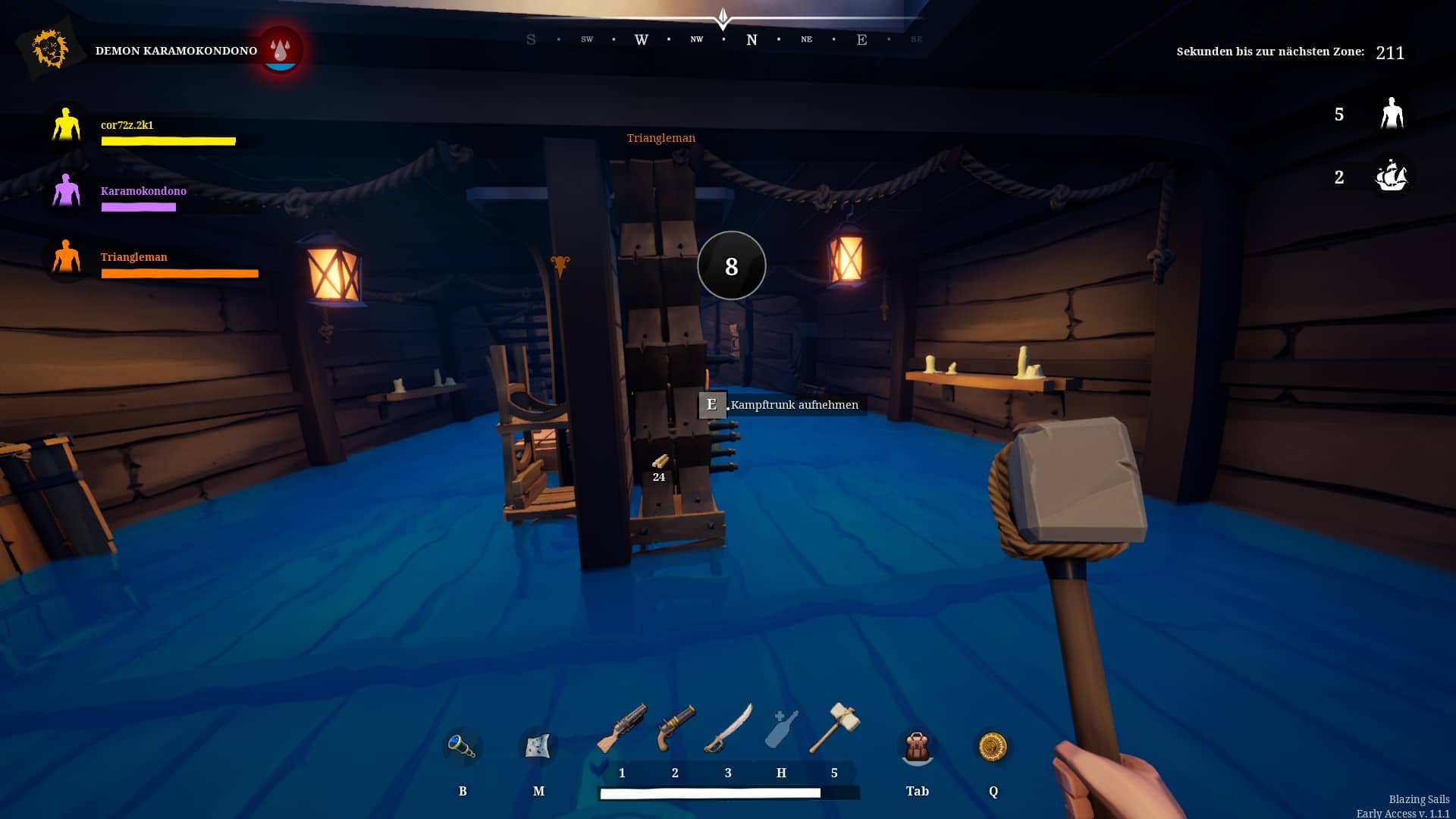 Mit genug Equipment an Bord, machen wir uns auf den Weg in Richtung Kartenmitte, denn wie bei so ziemlich jedem Battle Royale Spiel gibt es hier auch wieder eine Zone, welche sich verkleinert. In dieser sollte man sich nicht zu lange aufhalten, sonst kann unser Schiff einiges an Schaden nehmen, was nur unnötig Holz kostet, welches im Endkampf von einem entscheidenden Vorteil sein kann. Besonders gefährlich kann es auch werden, wenn ein gegnerisches Schiff einem zu nah kommt, denn die Gegner können an Bord unseres Schiffes kommen. Dies kann für eine Menge Chaos sorgen, oder noch schlimmer, sie ziehen den Korken des Schiffs. Somit fängt es an schnell mit Wasser vollzulaufen, dies kann sehr schnell das Ende für uns bedeuten. Natürlich können wir dem Gegner auch den Korken ziehen, jedoch hat da jeder seine eigene Taktik für Hochsee Gefechte. Der aufmerksame Leser hat bereits mitbekommen, dass wir bis zu vier Spieler an Bord haben können. Diese Anzahl ist auch bitter nötig, so braucht man einen Steuermann, am besten einen der sich um die Segel kümmert, denn diese müssen mit dem Wind ausgerichtet werden um effektiv zu sein. Die restlichen zwei Personen teilen sich die Aufgaben des Kanoniers oder des Reparateurs. Sollte es zu einem Gefecht kommen, ist es wichtig, dass man alles im Blick hat und jeder seine Aufgaben hat.