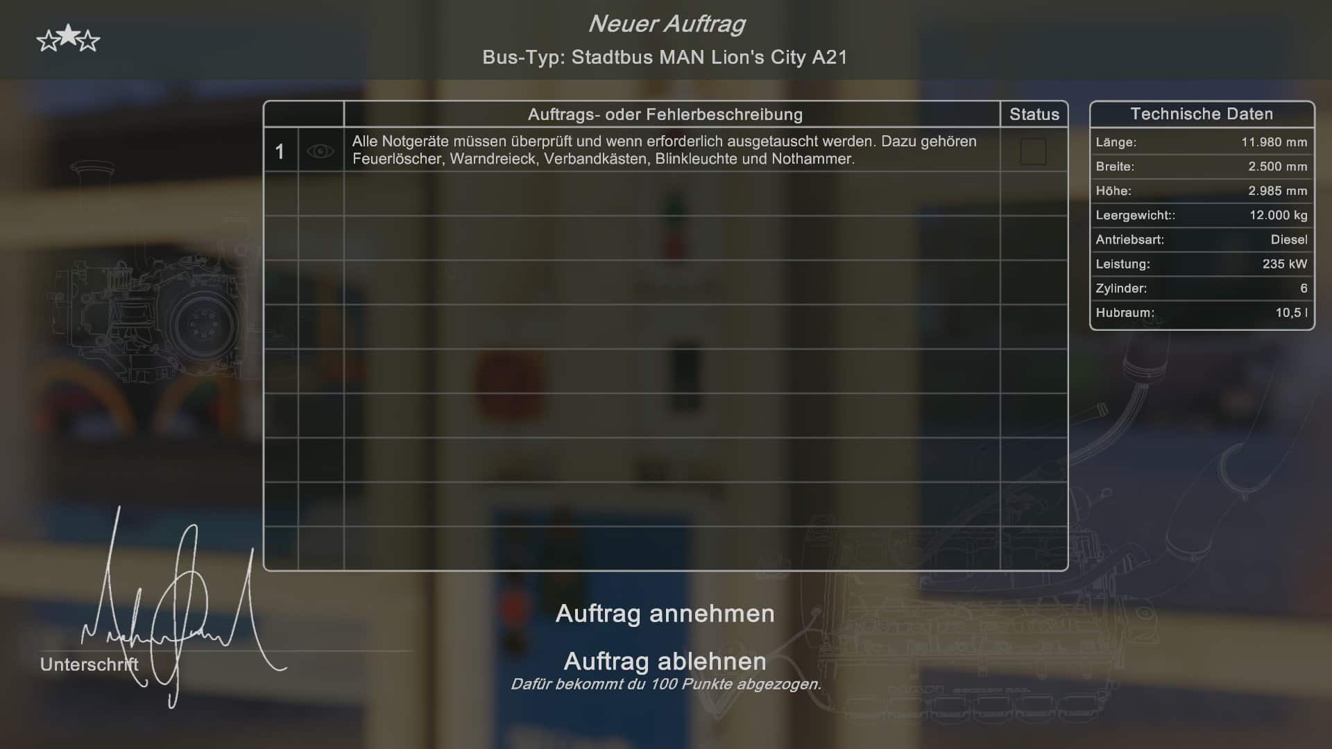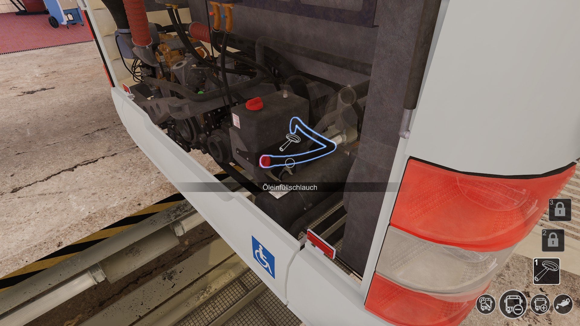 Unsere Aufgabe im Bus Mechanic Simulator besteht in der Reparatur von Bussen, wie es der Titel ja schon fast erahnen lässt. Hier haben wir zwei Möglichkeiten, entweder den Freien Modus, wo uns alle Möglichkeiten zur Verfügung stehen und wir den Bus nach Herzenslust zerlegen können, ohne jegliche Vorgaben. Zum anderen haben wir noch den Karriere-Modus, hier bekommen wir fortlaufend Aufgaben gestellt, einen Ölwechsel durchführen, Reifen-Luftdruck prüfen, oder später auch kompliziertere Aufgaben wie den Fehler an der Lenkung finden. Die Aufgaben sowie Probleme der Busse sind vielfältig. Durch das Abschließen der Aufträge erhalten wir kein Geld, sondern Erfahrungspunkte, welche uns weitere Hilfsmittel der Werkstatt freischalten, wie zum Beispiel den Prüfstand, welcher ein treuer Begleiter in späteren Aufträgen wird. Da wir kein Geld verdienen, stehen uns jederzeit alle Ersatzteile im lager zur Verfügung, schließlich soll sich auf den technischen Teil konzentriert werden und keine Werkstatt-Management Simulation dargestellt werden. Also heißt es ab in die Grube und den Bus auf Herz und Nieren durchgecheckt, es besteht sogar die Möglichkeit in den Bus hereinzugehen, schließlich kann auch am Cockpit oder den Sitzen gearbeitet werden.![]()