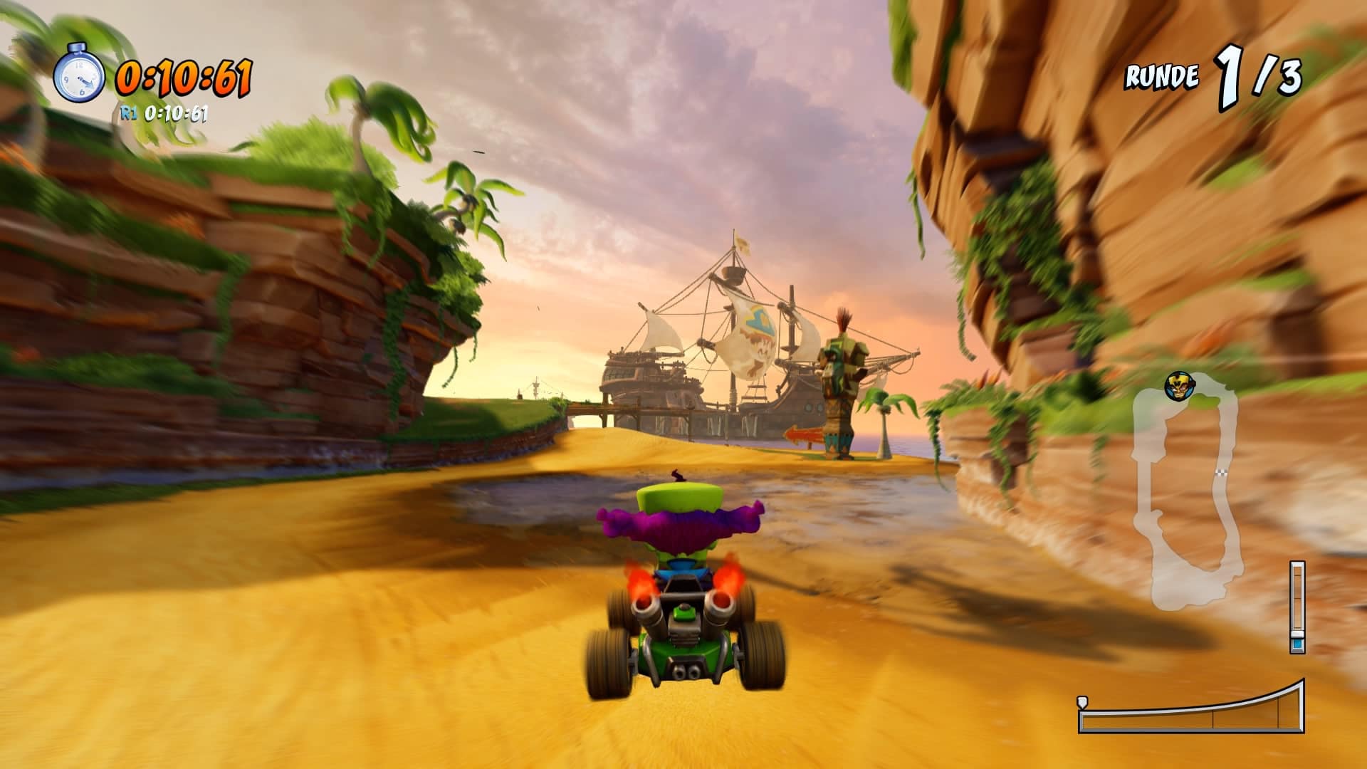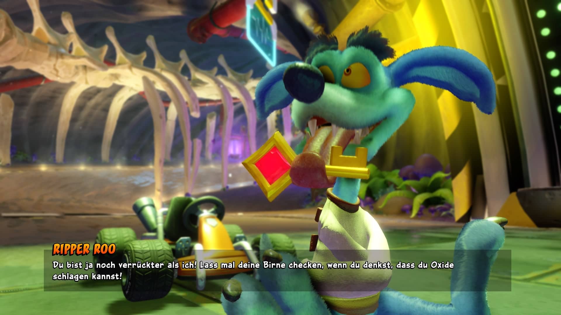 Kern von Crash Team Racing ist der Abenteuer Modus. Hier wird uns eine Geschichte erzählt zur Einführung, die so einfallslos ist, als hätte sie ein Finanzbeamter in seiner kreativen Schlafphase erfunden. Der Außerirdische Nitros Oxide möchte ein Rennen gegen den besten Fahrer der Erde fahren, denn er liebt Rennen. Sollte er gewinnen, wird die gesamte Erde zu einen Parkplatz und die Menschen versklavt. Eine Story die an Tiefgang den Mathe Telekolleg Konkurrenz macht. Doch wollen wir überhaupt Story? Ich muss sagen das drumherum ist mir echt egal, jedoch wirkt die ausgedachte Story echt lächerlich. Nachdem wir nun im Intro des Abenteuer Modus über die Hintergründe aufgeklärt wurden, geht es für uns los. Dieser Modus ist eins zu eins das selbe wie wir es aus dem Vorgänger der Neunziger Jahre gewohnt sind. Wir bewegen uns in einem befahrbaren HUB, wo wir Rennen starten können um Trophäen zu sammeln. Diese schalten wiederum neue Bereiche und Boss Gegner frei. Nichts allzu spektakuläres, aber vollkommen ausreichend. Während wir uns unseren Weg durch das Abenteuer bahnen, bekommen wir immer wieder neue Skins, die wir freischalten und Wumpa Münzen.