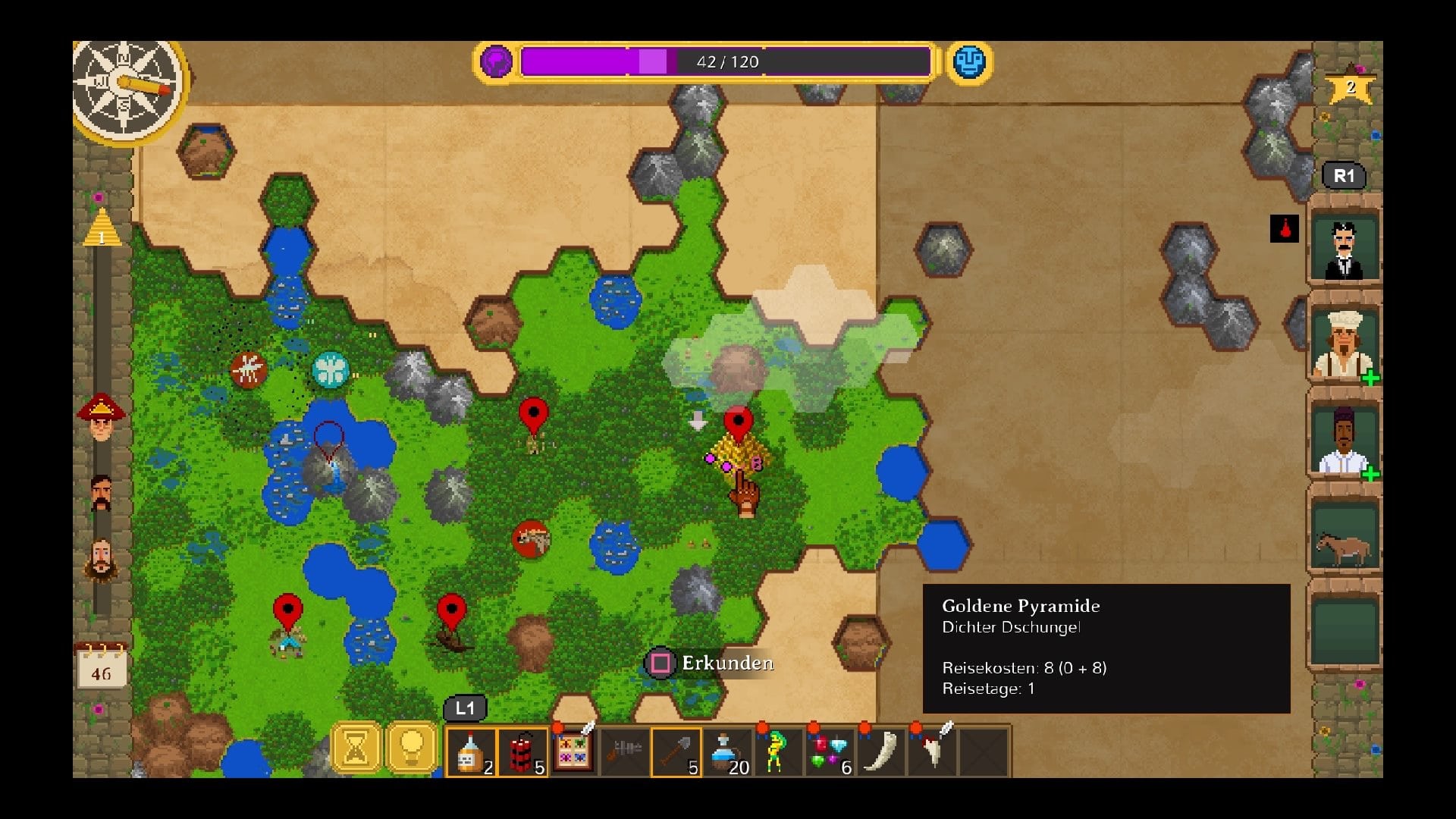 Curious Expedition ist ein Adventure mit Management Elementen, welches einiges an strategischen Geschick abfordert. Unsere Aufgabe ist es Expeditionen zu planen, in denen wir Schätze sammeln, Aufgaben erfüllen oder mit Eingeborenen Handel treiben. Hierfür erlangen wir Ruhm, dieser ist wichtig, denn nach 6 Expeditionen wird abgerechnet. Gegen andere K.I. Entdecker führen wir ein erbittertes Rennen um Ansehen. Wer am Ende am meisten hiervon erlangt hat, hat gewonnen. Klingt kompliziert, ist es aber nicht, zumindest nicht so, wie man es erwarten könnte. Es gibt keinerlei Hunger, Durst oder ähnliche andere Attribute während der Expedition. All diese Bedürfnisse unserer Expeditions-Gruppe werden in einer Wahnsinns-Leiste zusammengefasst. Erreicht diese Null, können unsere Mitstreiter zum Kannibalen werden oder Selbstmord begehen.