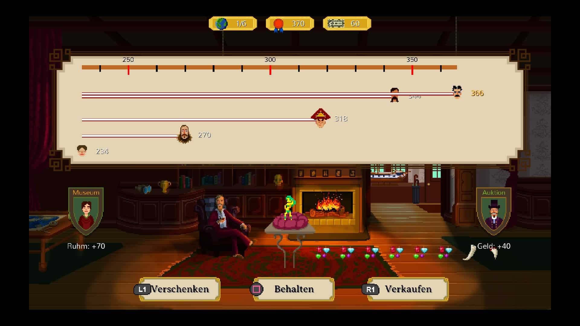 Zu Beginn unserer Reise können wir jedes Mal einen berühmten Entdecker auswählen, hier stehen uns einige zur Verfügung. Jeder hat besondere Fähigkeiten, welche uns unsere Missionen erleichtern können, je nachdem wie wir unser Vorgehen planen. Leider endet ein Spiel immer nach 6 Expeditionen, ein endlos Modus wäre hier noch wünschenswert gewesen. Versteht mich nicht falsch, es macht eine Menge Spaß, jedoch würde ich gerne noch ein wenig länger Spielen um ein berühmter Entdecker zu werden. Als Alternative können wir den Schwierigkeitsgrad auch erhöhen, um die Herausforderung zu steigern, jedoch endet hier das Spiel ebenfalls wieder nach 6 Expeditionen. Vielleicht wird hier irgendwann noch nachgebessert seitens des Entwicklers.