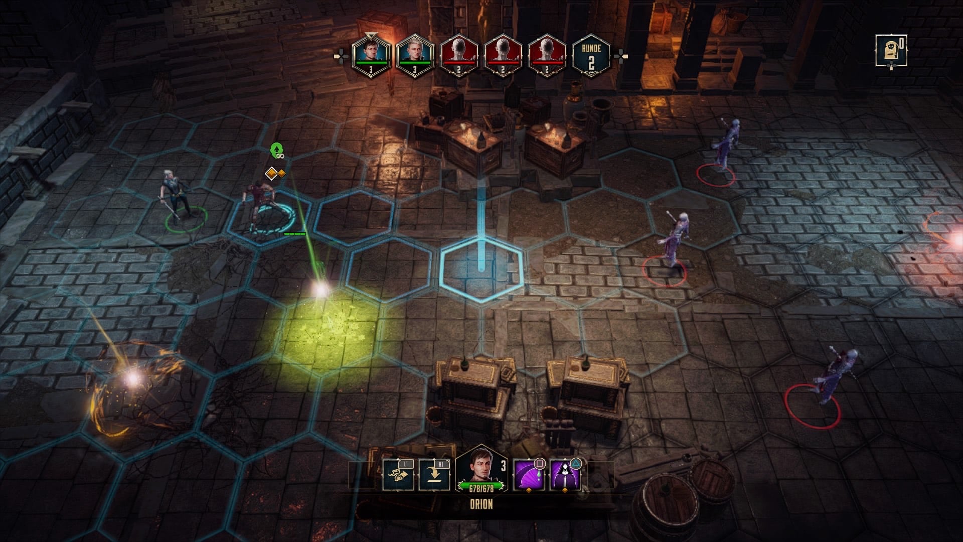 Dieses farbige Kristallsystem lässt Disciples: Liberation durchaus frischer und neuer wirken als andere Mitbewerber. So müssen wir sorgfältig auswählen, wie wir jeden Charakter verwenden, da ihre Fähigkeiten auf dem Schlachtfeld ehrlich gesagt mehr mit ihren AP-Kristallen zu tun haben als damit, wie stark sie sind oder was ihre jeweiligen spezifischen Fähigkeiten sind. So ist zum Beispiel einer der ersten Charaktere, der Schurke Orion, einer der nützlichsten. Das liegt daran, dass er zwei gelbe Kristalle hat, was bedeutet, dass er unglaublich vielseitig ist. Er kann sich zwei Mal bewegen, zwei Mal angreifen oder eben erst das eine, dann das andere. Obendrein hat er die Fähigkeit, sich für ein paar Runden unsichtbar zu machen und einen verheerenden Giftschlag auszuführen, wenn er in diesem Zustand angreift. Er ist eines der besten Beispiele dafür, wie der Kampf im Spiel dich dazu bringt, die dauerhaft damit zu befassen, wie deine Einheiten das Feld kontrollieren können. Die Felder auf denen wir kämpfen, haben alle ein sehr ähnliches Muster von Sechsecken. Sicher, im Laufe des Spiels werden die Layouts etwas abwechslungsreicher, aber sie sind weiterhin „nur“ ein Rechteck aus Sechsecken mit verschiedenen Hindernissen. Dies kann war auf der etwas eintönig wirken, vor allem bei einer längeren Gaming Session, jedoch ist dies Jammern auf hohem Niveau. Die kämpfe selbst laufen wie erwartet flüssig über den Bildschirm und spielen sich Butterweich von der Hand.