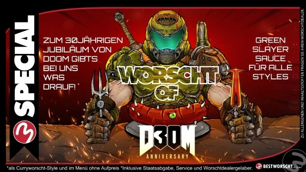 Um dieses besondere Jubiläum zu feiern, hat sich Bethesda etwas Einzigartiges einfallen lassen. In Zusammenarbeit mit dem Frankfurter Gastronomiebetrieb „Best Worscht in Town“ wird ab sofort die speziell entwickelte Green Slayer Sauce angeboten. Diese Sauce, inspiriert von Doom und seiner Präsenz in der Gaming-Welt, ist eine Hommage an den Klassiker und verspricht, Currywurst-Liebhaber auf eine geschmackliche Reise zu schicken.