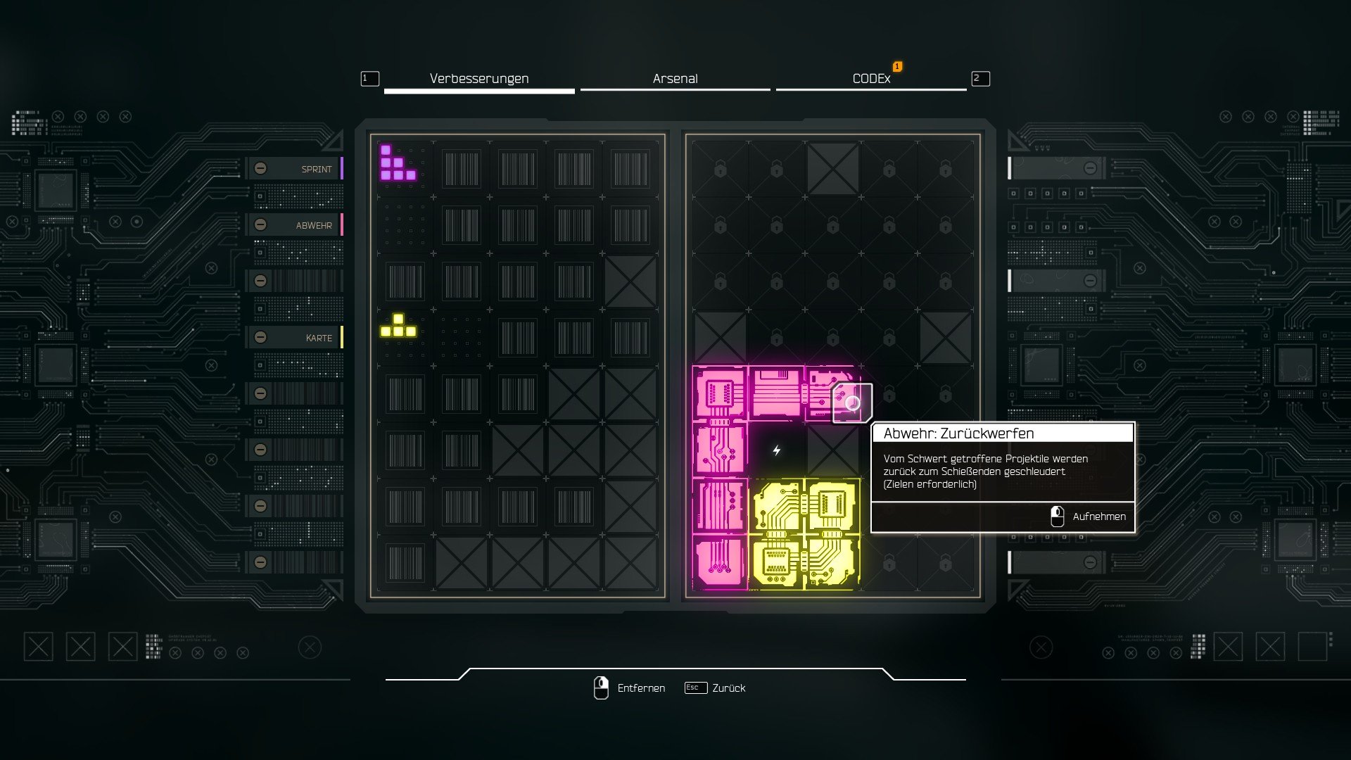 Die Fähigkeiten und Extras, die wir im Laufe des Spiels verdienen, müssen wir in ein Modul System einsetzen. Hier gibt es nur begrenzte Plätze, also gilt es genau abzuwägen, was man benötigt und was nicht. Eigentlich geht es hier sowieso um die persönlichen Präferenzen, denn jeder wird seinen eigenen Pace und sein eigenes Moveset für dieses Spiel entwickeln müssen. Gerade der Elektro Soundtrack, sowie die gute Grafik gepaart mit dem flüssigen Gameplay lassen einen die Welt um einen herum vergessen. Trotz unzähliger Tode und verpassten Sprungpassagen kommt kein Frust auf, keine Ahnung warum, aber es wirkt nicht frustrierend. Fordernd ist es trotzdem, eine Millisekunde unaufmerksam und ich startet erneut vom Checkpoint. Neben den normalen Gegnern erwarten einen auch zwei kleinere Bossfights. Diese sind episch und schon ein wenig mit Dark Souls zu vergleichen, es gilt hier sich die Angriffsmuster einzuprägen.