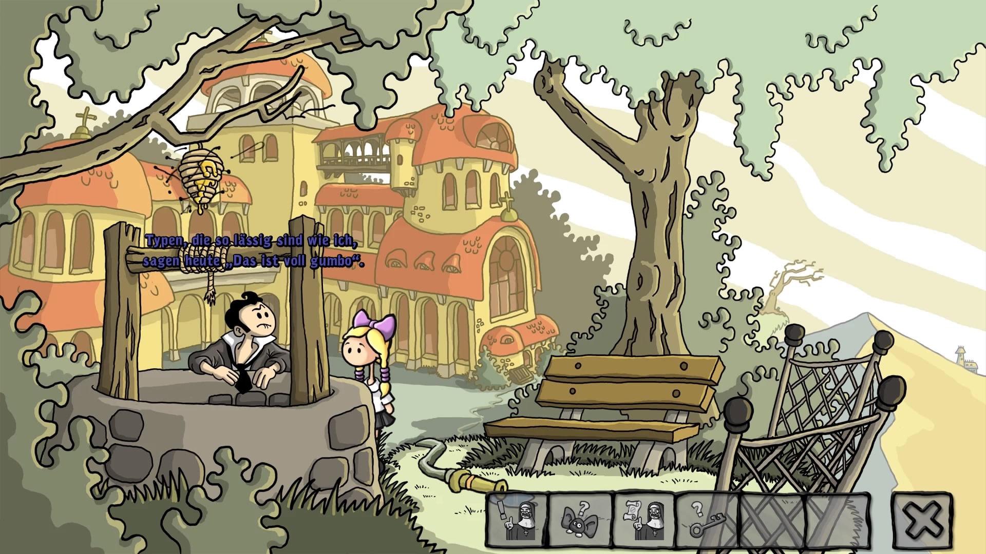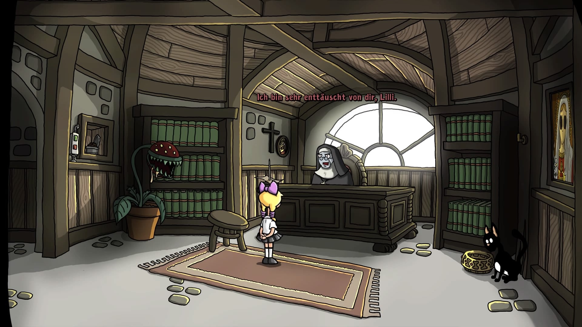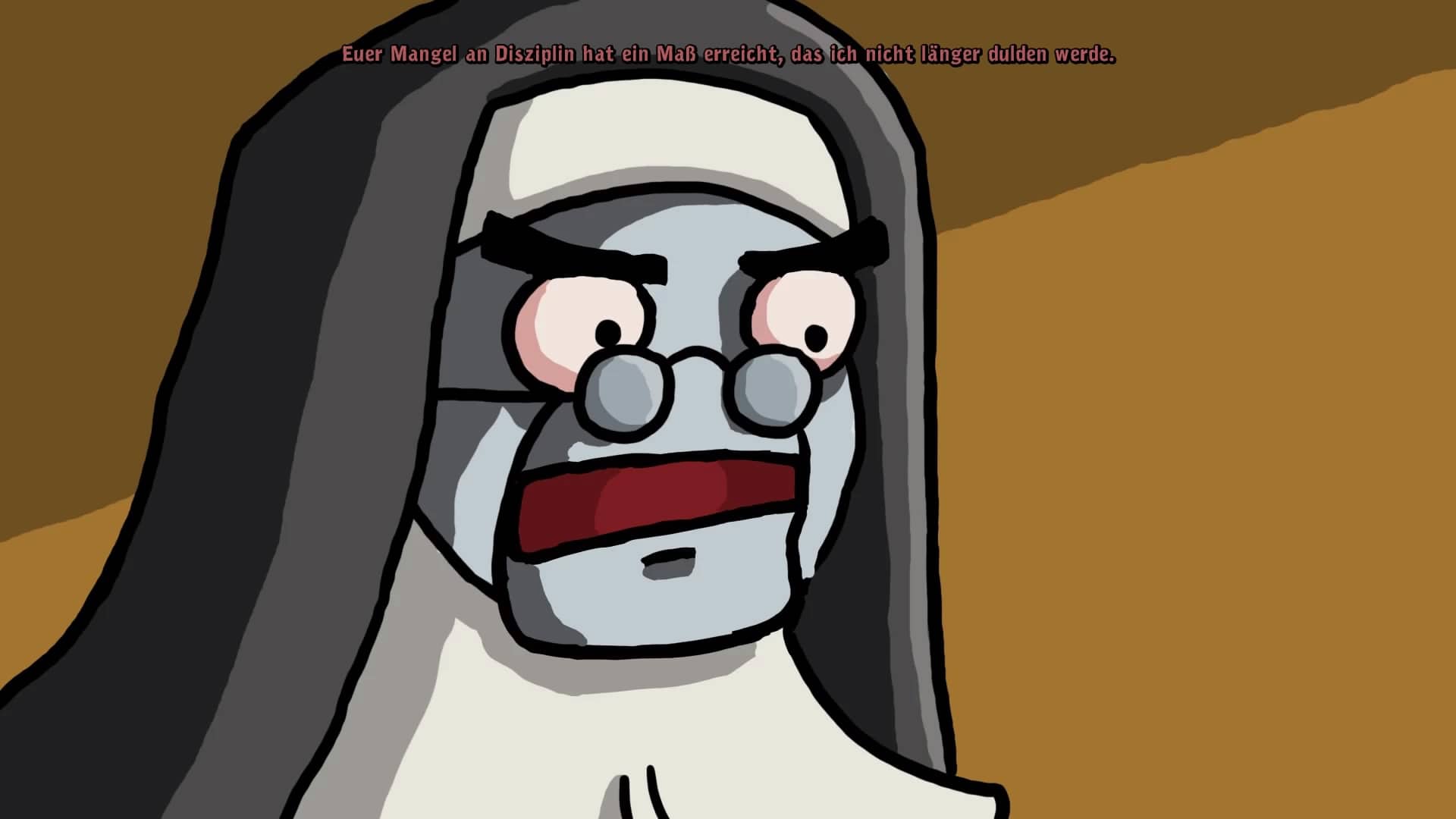 Zu allererst sei die Titelmusik von Jan Müller-Michaelis hervorgehoben. Mit dem Titel „Nadel und Faden“ hat er ein wahres Meisterwerk geschaffen, welches uns schon ein wenig auf die Stimmung des Spiels einstimmt. Wir sind Lilli, eine Klosterschülerin, die das ganze Spiel über keinen Ton von sich gibt, zumindest keine gesprochenen Worte. In Dialogen hört man von uns lediglich Laute wie „Nähäh“ oder „Ähä“. Wir sind nun einmal ein schüchternes Mädchen, was keine Lust hat mit anderen groß zu reden, denn andere sehen uns als Streberin, die das Chaos und Unglück quasi magisch anzieht. Doch ist das wirklich so, sind wir wirklich ein schlechter Mensch? Ohne euch die ganze Story zu Spoilern, wir sind nicht so zahm und unschuldig, wie wir auf den ersten Blick wirken. Beinahe jede Situation des Spiels wirkt stark überzeichnet und ist behaftet mit Ironie sowie schwarzen Humor.