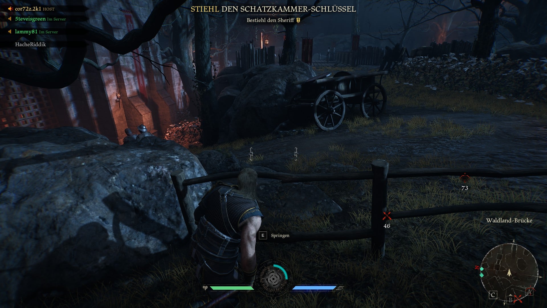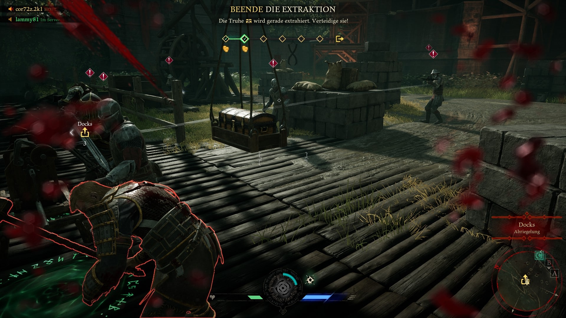 Hood Outlaws & Legends wirkt vom Spielprinzip einfach, jedoch gibt es einige Feinheiten, welche das Gameplay spannend aber auch frustrierend machen. Der Schlüssel zum Sieg kann ein leises Vorgehen sein, ich sage extra kann, denn auch mit brachialer Gewalt kann man einen Sieg einfahren. Die Grundlagen des Spiels sind einfach erklärt. Auf einer von fünf verschiedenen Karten gilt es denn Sheriff zu finden, ihm dem Schlüssel abzunehmen und mit dem Schlüssel die Schatzkammer zu öffnen. Das ist schon die halbe Miete. Doch nun folgt die letzte Phase, welche auch am meisten unausgereift ist. Denn zum Schluss gilt es die Schatzkiste zum Extraktions-Punkt zu bringen, hier gilt es dann die Kiste mit einer Seilwinde zu bergen. Die Bergung hat sieben Phasen, jedoch fängt hier das Problem des Spiels an sich bemerkbar zu machen. Hat man als Team bereits sechs Phasen abgeschlossen, heißt das noch nicht, dass man dem Sieg nahe ist. Das gegnerische Team kann euch töten und die letzte Phase schnell ausführen. Das resultiert in einem Sieg für das gegnerische Team, all die vorherige Mühe war umsonst. Na ja nicht ganz, zumindest gibt es ein wenig Erfahrung und Gold. ![]()