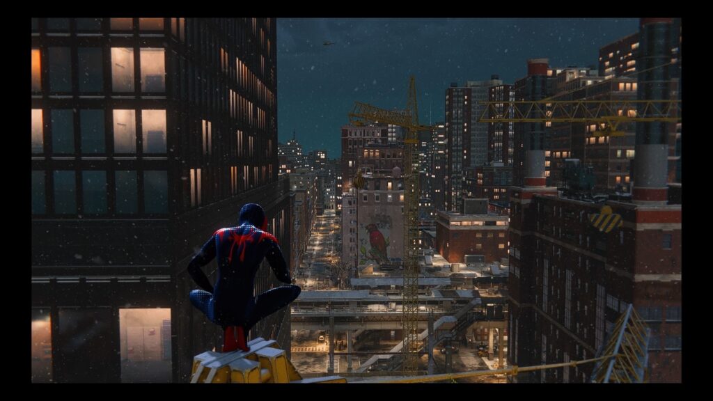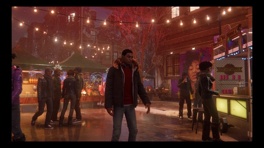 Miles ist ähnlich wie einst Peter Parker, ein intelligenter und teils noch etwas unsicherer Teenager. Auch er wurde von einer Spinne gebissen (Überraschung) und besitzt daher ähnliche Fähigkeiten wie der „große“ Spider-Man. Kein Wunder also, dass Peter Parker, Miles unter seine Fittiche nimmt und ihm so das Handwerk echten Spider-Man’s bestmöglich beibringt. Doch auch die freundliche Spinne aus der Nachbarschaft braucht mal Urlaub, so verabschiedet sich Peter Parker direkt in der Anfangsphase des Spiels. Miles übernimmt ab diesem Zeitpunkt die Heldenrolle in Manhattan und deckt ganz nebenbei eine Verschwörung um den skrupellosen Roxxon-Konzern auf. Die Hauptgeschichte selbst bietet zwischen 8 bis 10 Stunden Spielspaß. Da wir euch nicht zu viel Spoilern wollen, möchte ich mich hier eher kurz halten. Es ist eine klassische Spider-Man-Geschichte über Familie, Freundschaft und die Selbstfindung eines Teenagers. Welcher sich zu Beginn schwer damit tut in die Fußstapfen des „großen“ Peter Parker’s zu treten, hierbei ist er jedoch nicht allein, sein bester Freund Ganke Lee unterstützt ihn hierbei Tatkräftig von Computer aus. Die Hauptgeschichte selbst zieht sich wie ein roter Faden durch Manhattan und führt euch durch eine emotionale Reise, welche absolut stimmig ist. Zudem noch die festliche Atmosphäre, diese lässt euch nicht nur den Heiligabend bei der Familie Morales miterleben, sondern erzeugt auch mit Märkten und der herrlich geschmückten Stadt eine wunderschön festliche Stimmung.