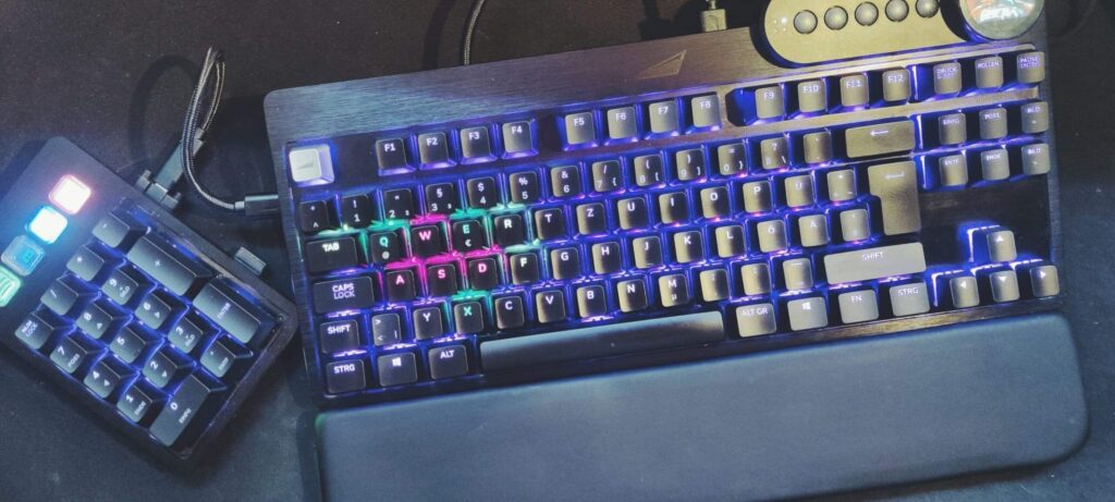 Die Verarbeitung der Mountain Everest Max sucht ihresgleichen. Ein gefrästes Aluminium Gehäuse, hochwertige Keycaps, eine ausgewogene RGB Beleuchtung sowie eine angenehme Handballenauflage. Das Gesamtpaket weiß dabei zu überzeugen. Ebenso überzeugend ist auch die Einstellung des Tastaturwinkels, nicht mittels starrer Rasten, sondern mit aufsteckbaren Magneten, lässt sich die Höhe der Mountain Everest einstellen. Wieder einmal ein Pluspunkt in der Individualisierung. Als abschließender Umfangreicher Personalisierung Bereich bietet sich noch die Mountain Software. Hier kann man die Tastatur mit allen möglichen RGB Beleuchtungsmodi einstellen, jede Taste mit einer einzelnen Farbe belegen? Kein Problem! Animierte Farbwechsel? kein Problem! Qualität, Leistung und Individualisierung, die auf ganzer Linie überzeugen. Was ein geiles Teil!