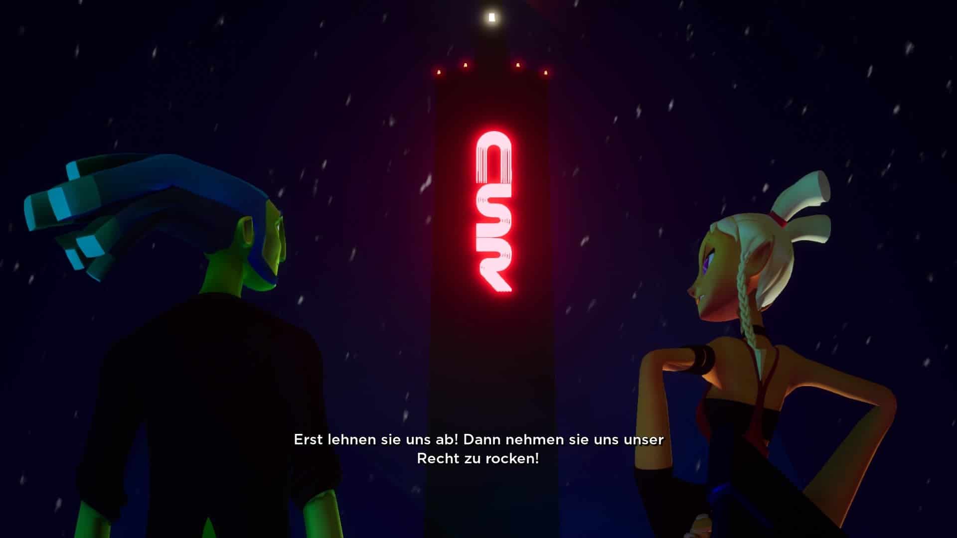 In No Straight Roads übernehmen wir die Rolle der Rock-Band Bunk Bed Junction. Diese besteht aus dem Drummer Zuke und der Gitarristin Mayday. Zuke ist eher entspannt sowie rational, wohingegen Mayday vollkommen aufgedreht und impulsiv von ihren Charakterzügen ist. Eine wunderbare Mischung, welche im Verlauf der Story immer mal wieder zu lustigen Situationen durch die ungleichen Charaktere führt. Doch um was geht es eigentlich in No Straight Roads? Die Stadt Vinyl City wird vom Megakonzern EDM beherrscht, jener versorgt die Stadt mit Strom, welcher durch EDM ( Electronic Dance Music) gewonnen wird. Mayday und Zuke machen sich auf den Weg zu der ständig stattfindenden Casting-Show, für neue Bands in Vinyl City, welche natürlich vom EDM Konzern veranstaltet wird. Wie nicht anders zu erwarten, werden sie abgelehnt, da sie Rock -Musik spielen. Beide beschließen nun, EDM den Kampf anzusagen, denn der Megakonzern regiert die Stadt eher wie ein diktatorisches Regime. Somit ist es nun an uns die „Stars“ von EDM auszuschalten, bzw. ihre Konzerte zu kapern.