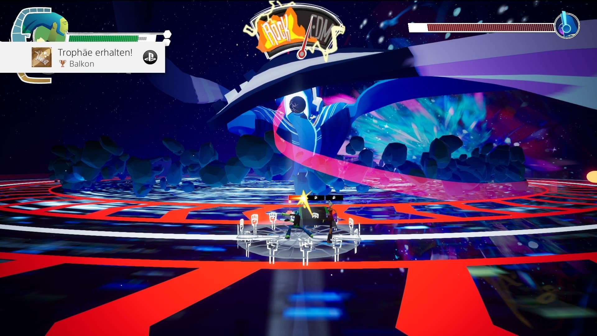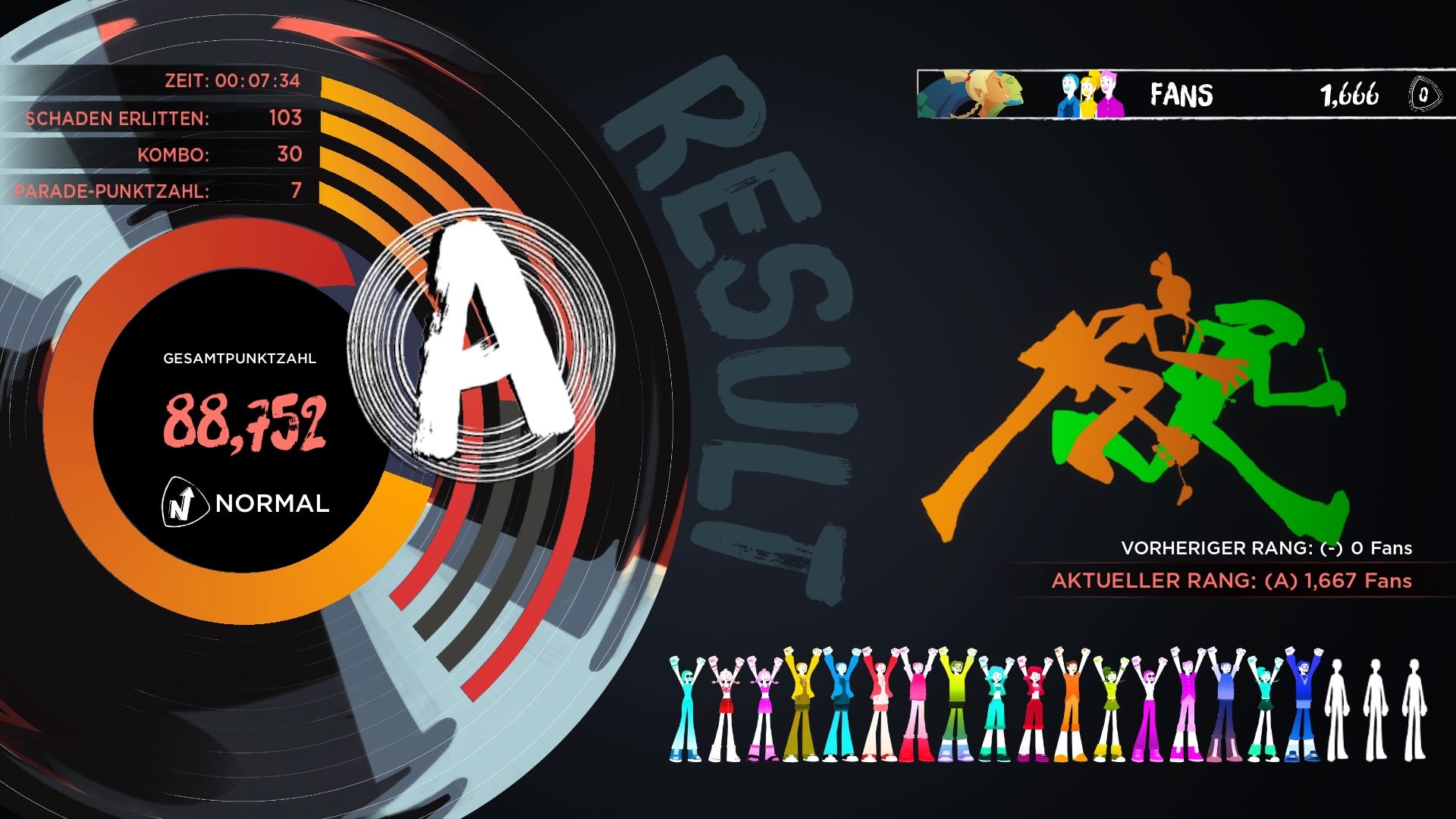 NSR setzt viel Wert auf Rhythmus. Attacken von Bossen oder Gegnern folgen einem Muster, welches dem Rhythmus der Musik folgen soll, leider funktioniert dies nur semi-perfekt. Der Rhythmus der Angriffe wurde leider nur in das Spiel beigemischt und passt nicht perfekt zu der Hintergrundmusik. Hat man jedoch erst einmal ein Muster erkannt, so kann man dies zu seinem Vorteil nutzen. Ähnlich verhält es sich bei den Bosskämpfen, welche den essenziellen Teil des Spiels ausmachen. Es müssen Angriffsmuster schon fast auswendig gelernt werden, um hier erfolgreich zu sein. Leider ist zum Teil bei Bosskämpfen so viel auf dem Bildschirm los, dass man schnell den Überblick verliert. Optisch sind eben diese zwar eindrucksvoll gestaltet, jedoch ist es manchmal einfach zu wuselig. Somit kommt es des Öfteren vor, dass man ungewollt einen Treffer des Gegners kassiert. Wurde man dabei zu Boden geschleudert, kann es leider ebenso vorkommen, das wir noch weitere Treffer kassieren, welches in einem Game Over resultieren. Wir können direkt wieder einsteigen an dieser Stelle, jedoch wirkt sich dies Negativ auf unsere Bewertung aus. Denn nach jedem geschafften Boss, bekommen wir eine Bewertung auf Zeit, genommenen Schaden, ausgeführte Kombos sowie Schwierigkeit. Je besser die Bewertung, desto höher die gewonnene Menge an neuen Fans, welche uns neue Attribute freischalten lässt. Sollten wir mit einer Bewertung nicht zufrieden sein, können wir jeden Boss wiederholen, unter anderem mit Modifikatoren, wie einer höheren Schwierigkeit um das Maximum herauszuholen.