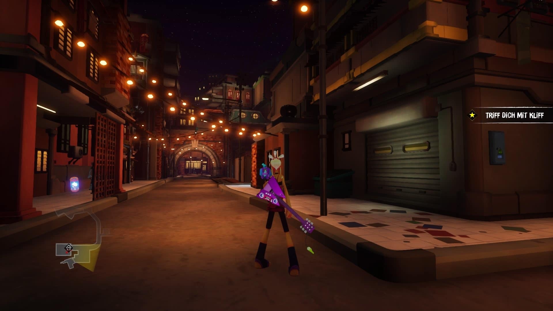 Zwischen den Boss Fights gilt es nun allerhand Items zu sammeln bzw. zu finden. Hierzu erkunden wir Vinyl City, mit Zuke oder Mayday, zwischen beiden können wir per Knopfdruck wechseln oder eben gleich im zwei Spieler Koop das Spiel starten. Leider artet diese Sammel-Orgie mehr in einem Grind aus, als das es Freude bringt. Die Stadt ist wunderschön gestaltet, ja sogar der ganze optische Stil des Spiels ist ansprechend, jedoch hinkt hier das Gameplay stark der optisch hohen Messlatte hinterher. Hinzu kommt noch eine schwammige Sprung-Steuerung, welche mich einige Male zum Verzweifeln gebracht hat. Das war für mich der Zeitpunkt, an dem ich mich in die Kanalisation zurückzog, dem Hauptquartier von Bunk Bed Junction. Hier können wir unsere Skills verbessern, Sammelgegenstände anschauen oder ein Mini-Spiel starten, welches auch viel Spaß gemacht hat. Leider kann das schöne Voice Acting und die wunderschöne Optik nur bedingt über das leicht oberflächliche Gameplay hinwegtäuschen. Man muss eben Kompromisse eingehen. Für die End-Credits, sprich das Besiegen der Bosse benötigt man gut und gerne 6 Stunden, möchte man nun noch alles sammeln, so kann man das Spiel auf knapp 15 Stunden ausdehnen. Leider wirkt dies künstlich in die Länge gestreckt.