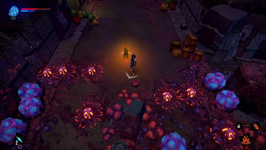 …wer wäre da besser geeignet das Gleichgewicht zu stören als die Dämonin „Vanessa“ und ihr Höllenhundgefährte? Das ganze klingt nach den besten Voraussetzungen für geballte Action – eine Geschichte, die überfüllt ist mit fiesen explosiven herumwandernden Leichen, Gallenbomben und menschenfressenden Pflanzen. Zu Beginn des Spielgeschehens werdet ihr von eurem Höllenhund „Monty“ noch alleine gelassen. Hier wird sichergestellt, dass es keine kooperativen Aktionen gibt, bis ihr die Grundlagen der Steuerung sowie des Kampfes beherrscht. Hierbei erlernt man verschiedene Möglichkeiten die Gegnermassen zu verletzen, einen leichten, sowie einen schweren Schlag, eine Art Tackle und natürlich einen Fernkampf-Angriff. Direkt im Anschluss kehrt Monty zurück, ab hier kann der Koop-Modus aktiviert werden. Am besten solltet ihr noch einen Freund mitnehmen, da die Single-Player-Steuerung von Monty nicht wirklich zu einer optimalen Nutzung seiner Fähigkeiten führt (& so ganz unter uns, es macht ja auch deutlich mehr Spaß zu zweit). Ähnlich wie Vanessa verfügt der Höllenhund über verschiedene Angriffsmöglichkeiten, wodurch sich die Schadensmöglichkeiten dieses dynamischen Duos im Wesentlichen verdoppeln. An sich macht es keinen großen Unterschied wer von euch Spieler 1 und 2 ist, abgesehen von der Tatsache, dass Spieler 2 sich nicht allzu weit von Spieler 1 entfernen darf (ansonsten kommt ihr via Teleport zurück zu Vanessa).