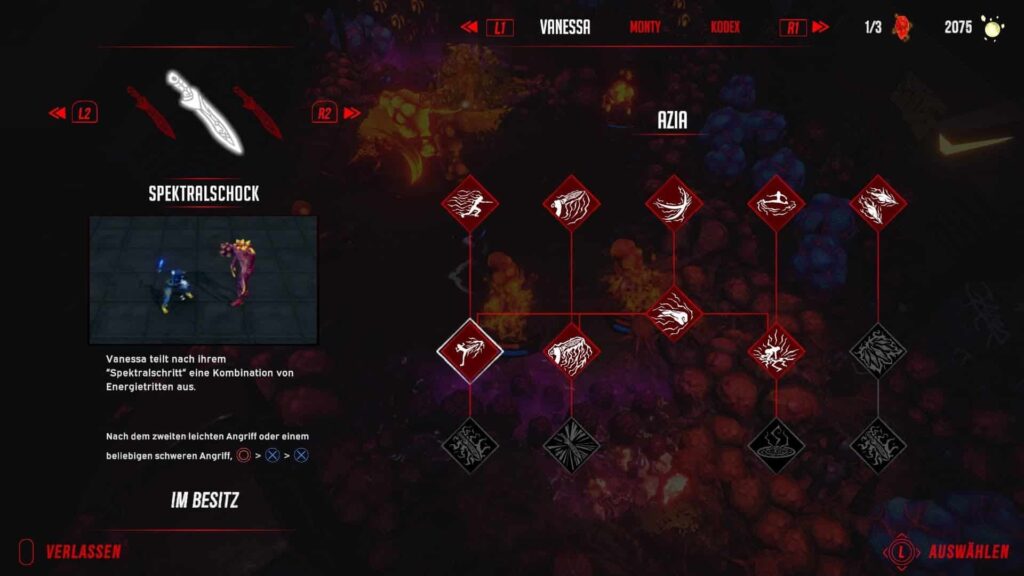 …dank eines mehrstufigen Fertigkeitenbaums, sowohl für Vanessa, als auch für Monty werden im Laufe der Zeit zusätzliche Angriffe möglich. Darunter einige, die euch zum Beispiel etwas Spielraum verschaffen, indem ihr Gegner in der Nähe schweben/fliegen lasst. Um euch zu verbessern müsst ihr nur die verschiedenen Edelsteine sammeln, welche es reichlich in allen Ecken zu finden gibt. Auch eine Vielzahl verschiedener Waffen für Vanessa ist mit an Bord, jede mit einer anderen Reichweite sowie Angriffsgeschwindigkeit, vielleicht sogar eine mit der Fähigkeit blutrünstige Schergen zu beschwören (wer weiß das schon).