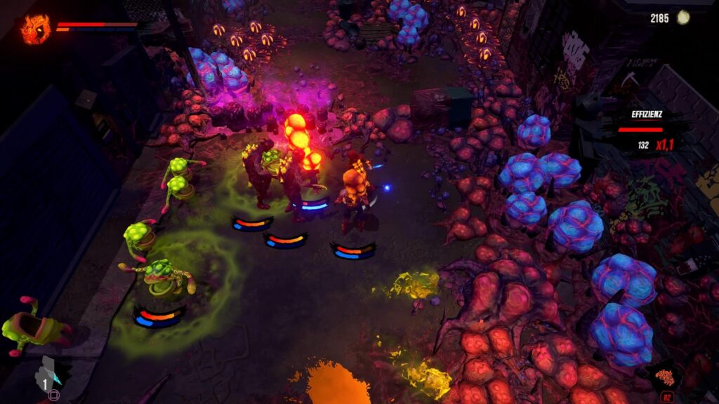 …gerade grafisch hebt sich Obey Me von der Masse ab. Hier erhält man ein Kunterbuntes Gemetzel in wunderschöner Neon-Optik, welches einen ganz eigenen Charme mit sich bringt. Die Entwickler haben hier viel Wert auf Details gelegt, so findet man immer wieder die eine oder andre Überraschung in abgelegenen Hinterhöfen. Auch die Steuerung über die Sticks des Controllers läuft flüssig und lässt euch selbst im härtesten Kampf nicht im Stich.