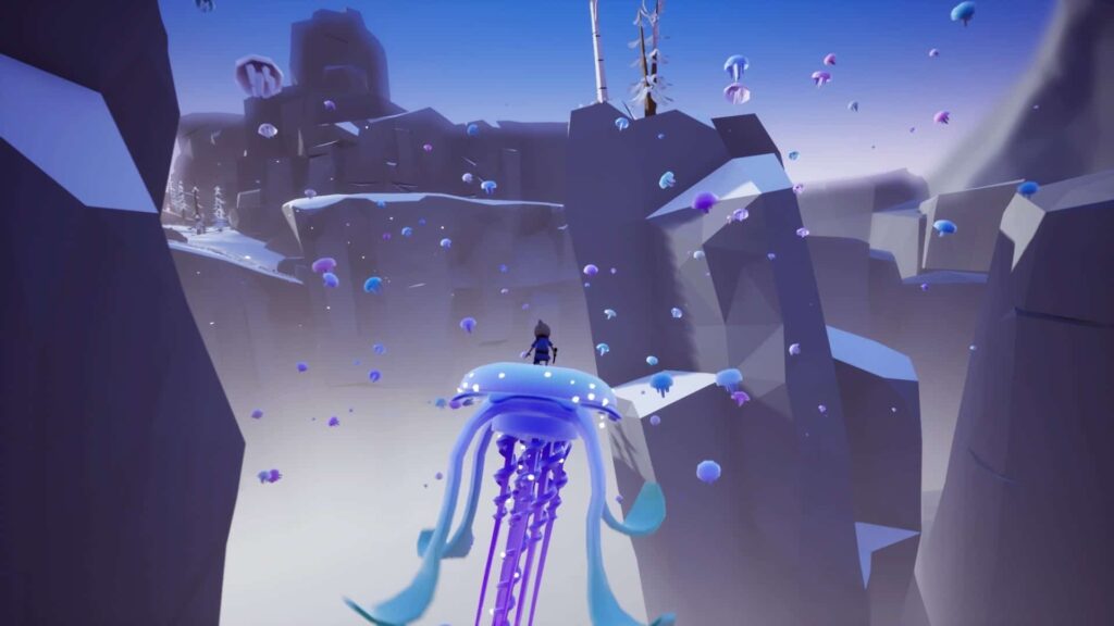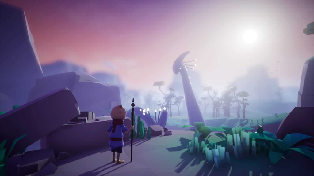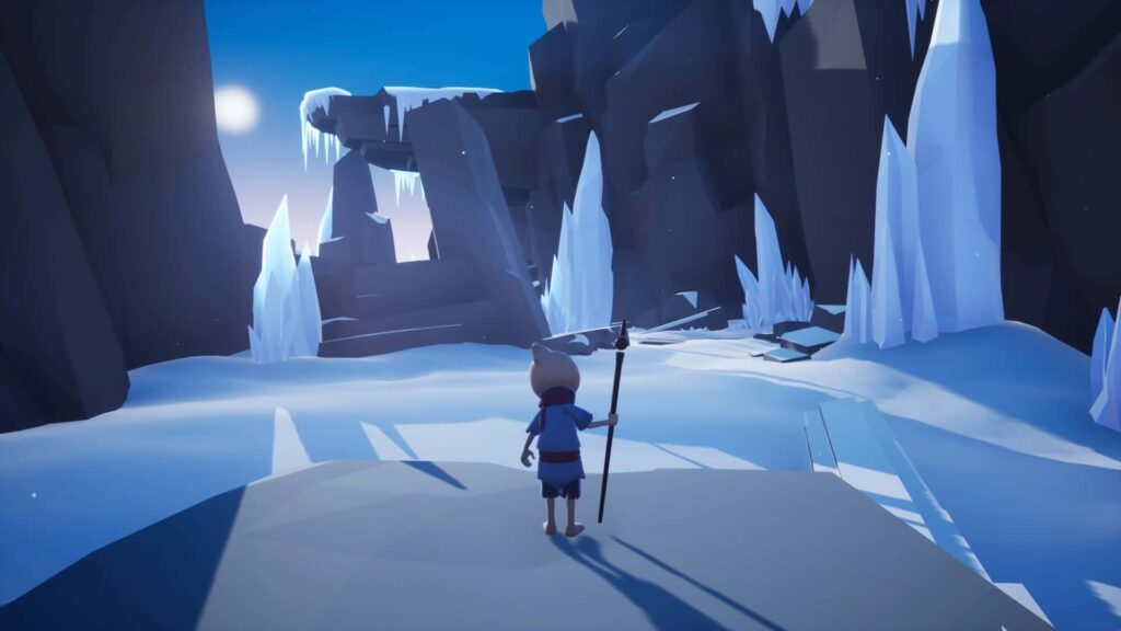 In Omno erwachen wir als Pilgerwesen mit Stab, dass die Aufgabe hat dem Licht zu folgen. Bei dem Licht handelt es sich in diesem Fall um eine Art Energiequelle, die über verschiedenste Umgebungen verstreut ist. Im gesamten gibt es 8 verschiedenen Areale, hier wird von blühenden Landschaften über Wüsten bis hin zu eisigen Gletschern alles geboten. In jedem Areal müssen wir mindestens drei leuchtende Kugeln einsammeln, um voranzukommen. Um an jede Lichtkugel zu gelangen müssen wir in der Regel ein paar Plattformen überwinden sowie das ein oder andere „leichte“ Rätsel lösen. Diese werden wie man es sich schon denken kann von Abschnitt zu Abschnitt schwieriger, sind jedoch absolut machbar. Natürlich ist bei alle den Rätseln und Aufgaben der Stab unseres Pilgerwesen’s eine große Hilfe. Dieser lässt euch im Laufe des Spiels beispielsweise Teleportieren oder ganz entspannt durch die Luft gleiten um entfernte Plattformen erreichen zu können. Zudem gibt es in jedem Areal eine Menge zu entdecken.
