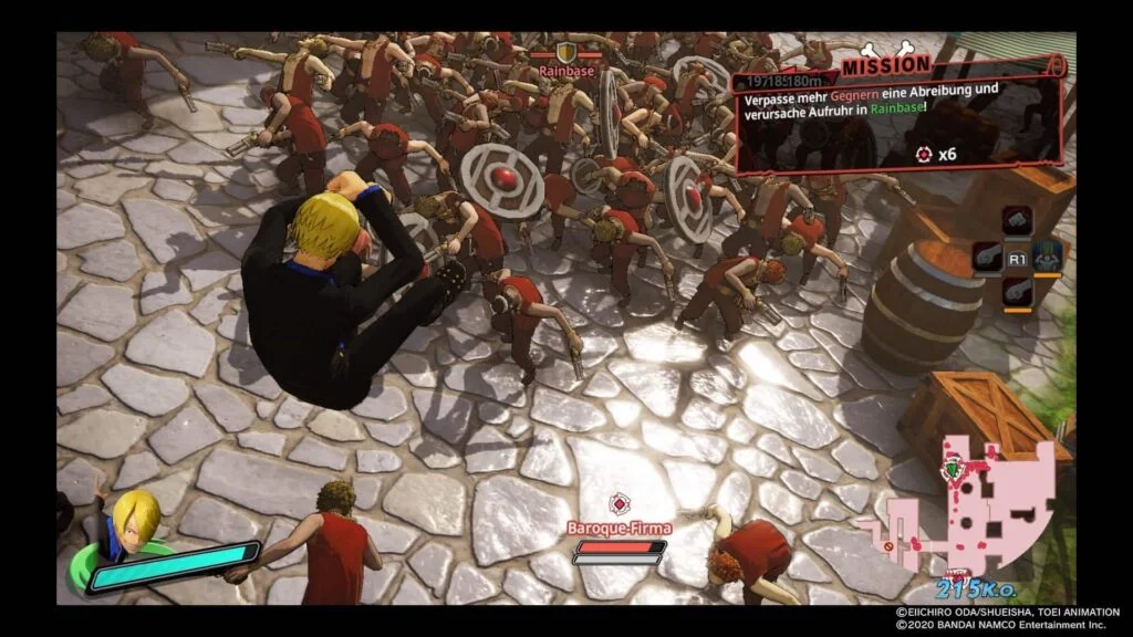 In den ersten paar Abschnitten der Storykampagne, die ihr bereits früh auch online im Kooperativbetrieb angehen dürft, ist eure Charakterauswahl noch teils stark begrenzt. Im Spielverlauf, der euch in einem Durchgang ca. 15 Stunden beschäftigen wird, seid ihr aber nicht nur als Monkey D. Ruffy unterwegs. Insgesamt stehen mehr als 40 spielbare Charaktere innerhalb der einzelnen Kapitel zur Auswahl, in denen ihr neben den frühen Mitgliedern der Strohhutbande auch immer wieder die Rollen von (teils nur anfangs) verfeindeten Protagonisten schlüpft. Daneben gibt es etliche freie Missionen, die für unzählige weitere Spielstunden gut sind. Abwechslung ergibt sich spielerisch primär durch die verschiedenen Charaktere, die sich allesamt unterschiedlich spielen lassen. Während sich Charaktere wie Katakuri oder auch Ruffy auf ihre Teufelskräfte und blanken Fäuste verlassen, setzen Zorro sowie Falkenauge beispielsweise auf ihre Schwerter, wohingegen Nami eher auf Gadgets setzt. Wie man hier schon erahnen kann ist eine Vielfalt durch die vielen Charaktere vorhanden und lässt das Geschehen keinesfalls langweilig werden.