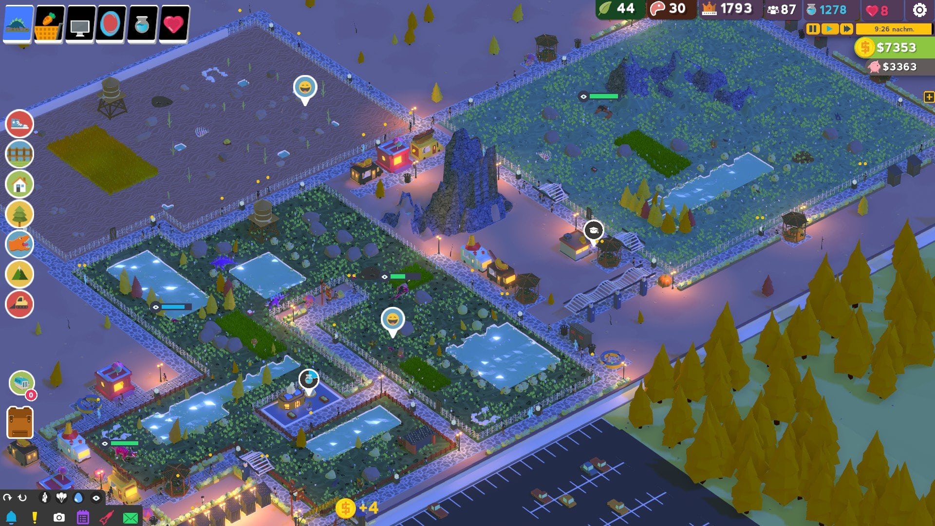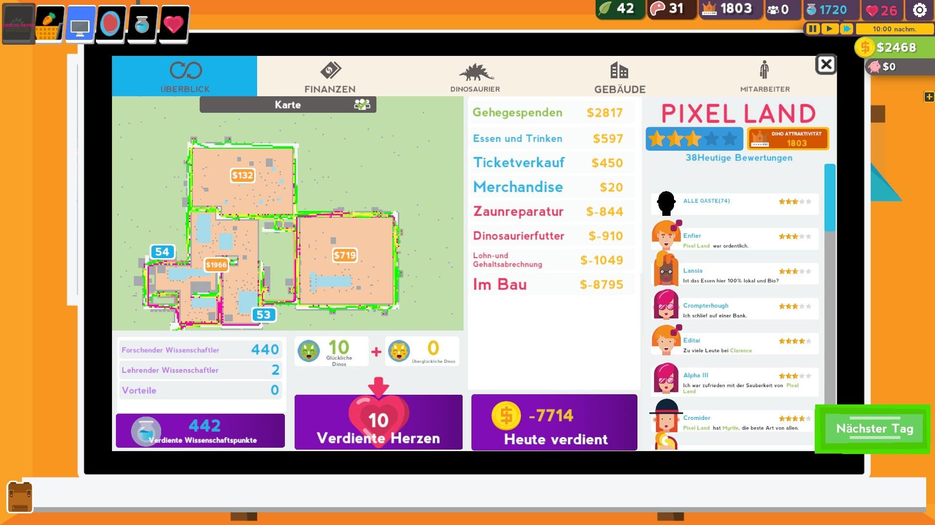 Besonders liebevoll gestaltet ist das jeweilige Ende eines Park Tages. Wir bekommen eine detaillierte Auflistung, wo welche Besucher am meisten waren, für was Geld ausgegeben wurde und wir können Parkbewertungen auf Social Media von den Besuchern lesen. Mitunter sind hier sehr absurde aber auch komische Bewertungen bei, für einen kleinen Lacher sind sie definitiv gut. Ansprechend fand ich auch den Ego-Perspektiven Modus, hier können wir selbst den Park besichtigen und notfalls mit einem Betäubungsgewehr unsere Dinos in das Reich der Träume schicken. Dies ist nötig, wenn sie umgesiedelt werden sollen oder Krank sind. Hat Parkasaurus auf den ersten Blick einfach und simpel gewirkt, entpuppt es sich nach längerer Spielzeit schon ein wenig komplexer. Grafisch passt die leichte Comic-Voxel Optik wunderbar zum Setting ebenso die entspannende Musik fügt sich wunderbar ein. Ein absolutes Highlight ist jedoch die Geräuschkulisse, welche von den Dinosauriern ausgeht. Positiv sei noch anzumerken, dass eine deutsche Übersetzung ebenso mit dabei ist, ein paar Sätze sind leicht fehlerhaft, jedoch gut zu verstehen.![]()