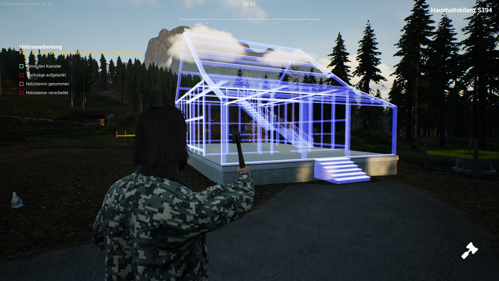Nachdem man nun das alte Haus abgerissen hat, geht es an den Wiederaufbau. Hierfür müssen Bäume gefällt werden, was mit einem einfachen Tastendruck geht. Das war ja einfach, jedoch wird es jetzt erst wieder fordernd denn die Baumstämme müssen zersägt werden. Das macht man im Holzschuppen, mittels einer Kreissäge. Diese Prozedur kann aufwendig sein und lässt einen wieder den Simulationscharakter spüren. Nachdem man nun Bretter hergestellt hat und das Haus an einer vordefinierten Stelle wieder aufgebaut hat, kann man sich nun dem Farm-Leben zuwenden. Mit dem kleinen Transport Fahrzeug geht es zum lokalen Händler. Mit ein wenig Geld, was wir auf der hohen Kante haben, kann der Großeinkauf beginnen. Ein paar Hühner, Werkzeuge und mehrere Sack Weizen werden gekauft und auf der Ladefläche verstaut. Auf dem Rückweg machen wir noch einen Abstecher bei der Tankstelle, um unseren Reservekanister zu füllen. Denn alle Fahrzeuge in Ranch Sim verbrauchen auch Benzin. Es empfiehlt sich also immer Benzin dabei zu haben, was gibt es sonst schlimmeres, als ohne Kraftstoff liegenzubleiben. Neben Hühnern kann man sich noch auf Schweinezucht oder Kühe spezialisieren. Wem das Verkaufen von den eigenen Erzeugnissen zu langweilig ist, kann sich auch auf Wildtier Jagd begeben. Aktuell sind Bären sowie Rehe im Spiel enthalten. Diese kann man erschießen und dann ihr Fleisch verkaufen. Leider ist die KI der Wildtiere nicht gerade gut ausgereift, jedoch macht auch das Jagen Spaß.
