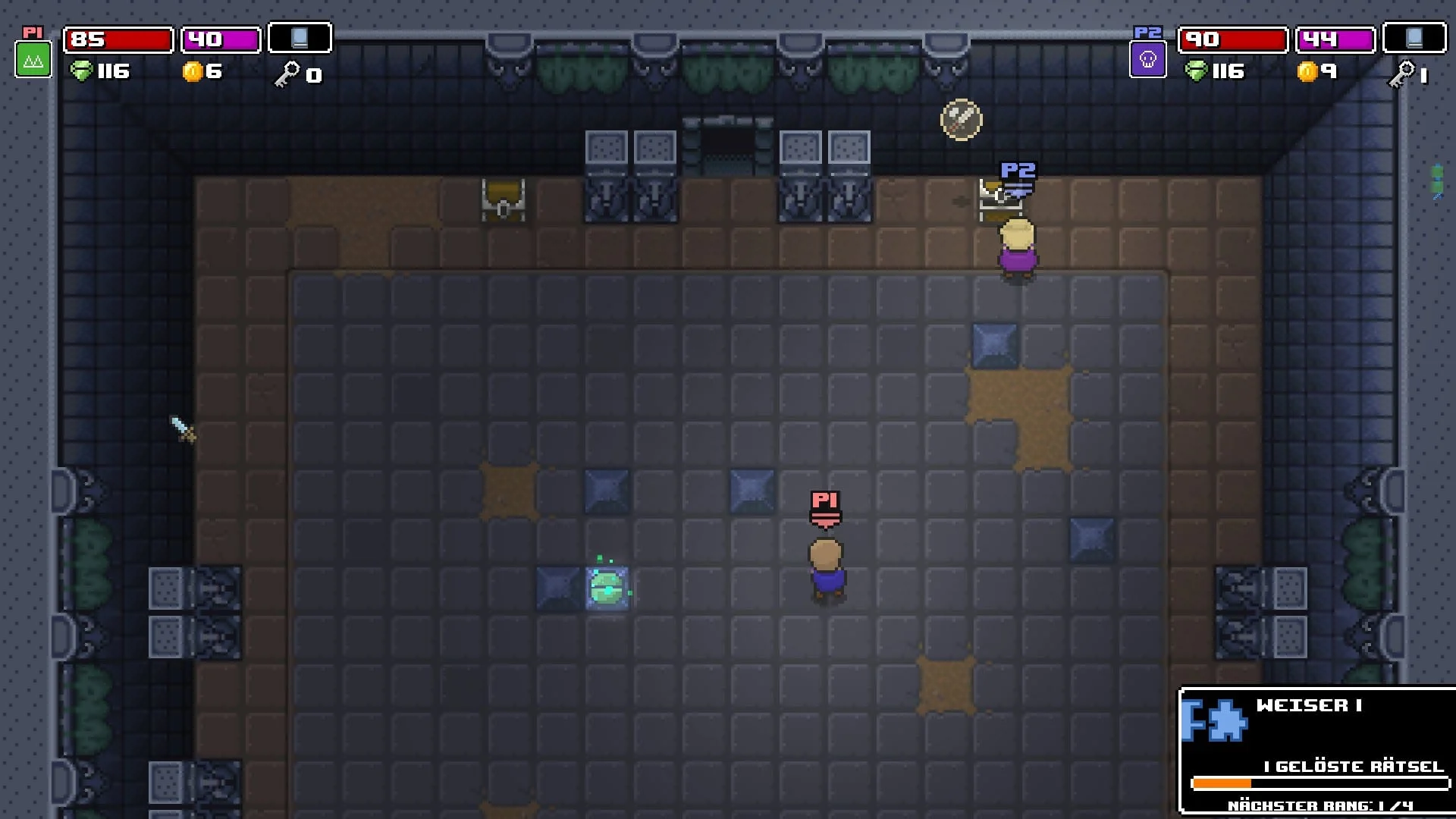 Wie bereits zuvor erwähnt, verlasst ihr mit eurem Ableben den Dungeon und müsst euch wieder auf ein neues vorarbeiten. Solltet ihr nun aber bis zu drei Freunde haben, welche mit euch spielen möchten, so habt ihr einen entscheidenden Vorteil. Eure Mitspieler können eure Leiche im Dungeon gegen Edelsteine wiederbeleben, somit könnt ihr weiter den Dungeon erkunden und Juwelen farmen. Alleine habt ihr da natürlich schlechte Karten, aber keine Sorge auch alleine ist Rogue Heroes meisterbar. Neben den Dungeons gibt es aber auf der Karte noch allerhand interessante Dinge zu entdecken, wie zum Beispiel versteckte Verbesserungen und ein paar kleinere Nebenquests. Auf den ersten Blick wirkt alles sehr ausgewogen und Umfangreich. Spielt man nun aber ein wenig länger, fällt auf, das Balancing ist leider nicht perfekt umgesetzt. Die meiste Zeit habe ich im ersten Dungeon verbracht, um mir genug Juwelen für Verbesserungen zu verdienen. Nachdem ich den Dungeon geschafft habe, fühlte sich mein Charakter bereits so stark an, dass der zweite Dungeon ein Spaziergang war. Sobald man den ersten gemeistert hat, welcher zu Beginn schwer ist, wird das Spiel verhältnismäßig leicht, schließlich ist man schon gut genug ausgerüstet. Das Einzige was einem noch ab und an Kopfzerbrechen bereiten kann, sind die Rätsel auf der Oberwelt Karte oder in den Dungeons, da wie schon gesagt, die Kämpfe mittlerweile ein Kinderspiel geworden sind.![]()