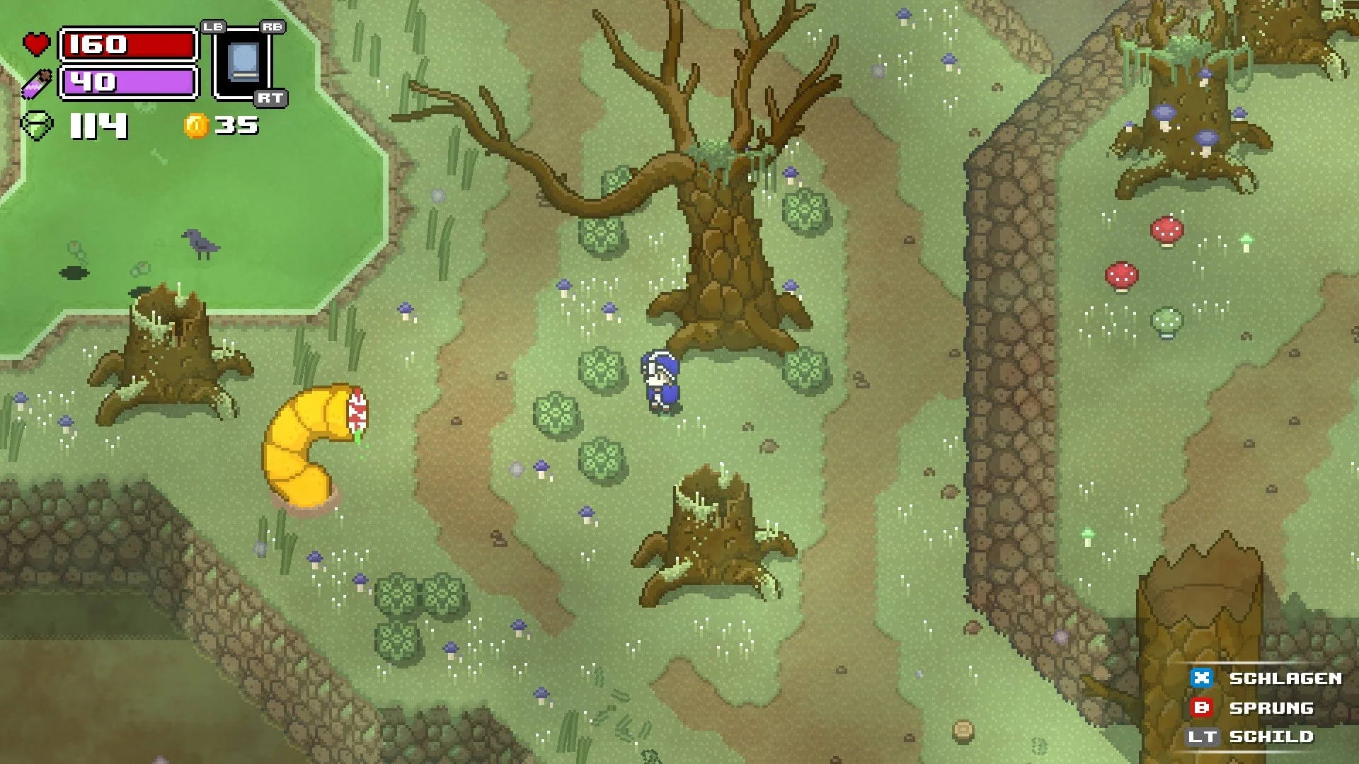 Rogue Heroes ist in einer Pixel Optik gehalten, welche mich unweigerlich in das Jahr 1991 zurückwirft. Warum genau 1991? The Legend of Zelda: A Link to the Past ist erschienen und Rogue Heroes greift genau den Vibe des 16-Bit Zeldas auf. Farblich, Optisch und auch in Sachen Dungeon Design erinnert es mich stark an das Abenteuer von Link auf dem SNES. Rogue Heroes wirkt schon fast wie eine Hommage an den erfolgreichen Titel aus den 90ern, nur mit dem Unterschied, das Rogue Heroes ein ganz anderes Spielkonzept aufgreift. Rogue Heroes baut ganz klar auf dem Rogue-Lite Prinzip auf, mit der Zeit immer besser zu werden. Es existiert eine Weltkarte, welche unveränderlich ist, auf eben jener sind 4 Dungeons verstreut. Die Hauptzeit des Spiels werdet ihr in den Dungeons verbringen, denn hier schafft man den Grundstein für seine Verbesserungen. In den Verließen gibt es Diamanten, welche man gegen Verbesserungen eintauschen kann. Solltet man sterben, spawned man im Dorf und kann seine gesammelten Edelsteine für bessere Stats eintauschen oder mit ihnen weitere Häuser für das Dorf freischalten. Die neuen Häuser ermöglichen einen neue Möglichkeiten der Verbesserung oder die Erforschung neuer Charakterklassen.![]()