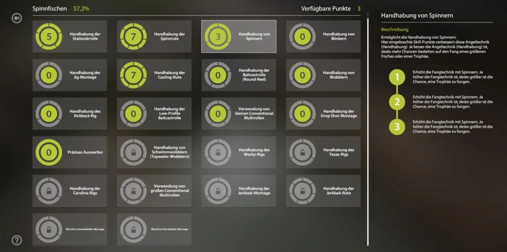 Ein Aspekt, welcher wirklich erwähnenswert ist und RF4 im Vergleich zu anderen Angel-Simulationen besonders glänzen lässt ist das, meiner Meinung nach, wirklich gut durchdachte Skill-System. Für jede Angel Art wurde ein eigener Skill-Baum entwickelt, in dem du deine Skill-Punkte versenkst, um spezielle Angeltechniken zu verbessern und so eine höhere Chance zu haben maßige Fische oder sogar Trophäen zu fangen. Auch für die Herstellung von Futtermischen und Köderbeschaffung gibt es separate Skill-Bäume. Die Skill-Punkte selbst bekommt ihr bei jedem Levelaufstieg, jedoch müsste ihr eure Fähigkeiten wie zum Beispiel Grundangeln oder Köderbeschaffung leveln, um gewisse Skills mit Punkten aufzuwerten zu können bzw. um diese freizuschalten. Das Hochleveln der Fähigkeiten geschieht letztendlich durch leveln by doing.