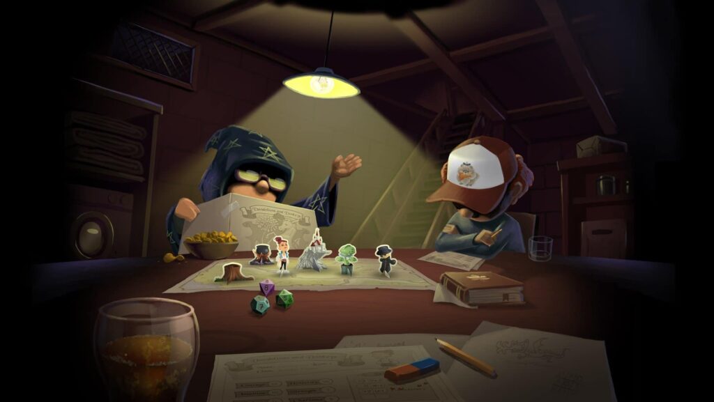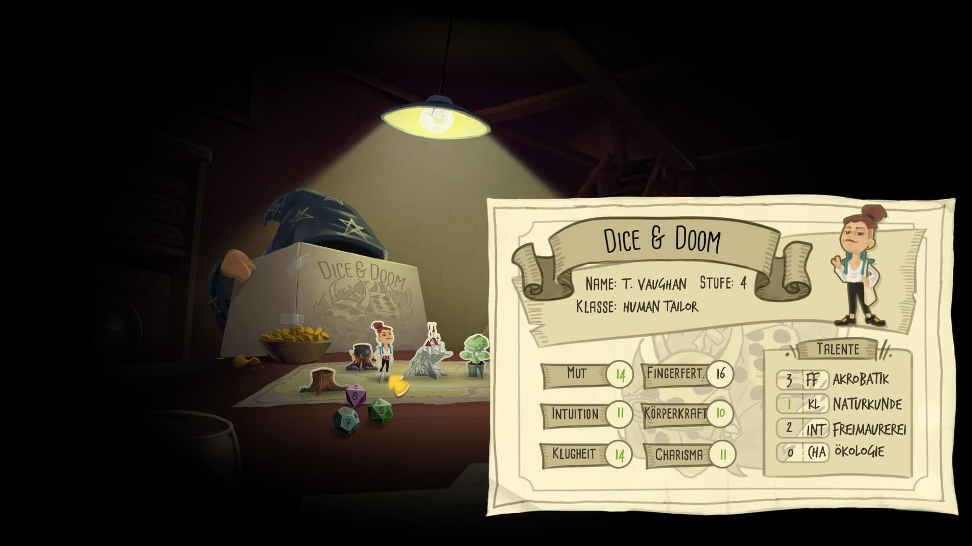 Ich habe in meinem Leben schon eine Menge Adventures, mit den verschiedensten Thematiken gespielt, von Indiana Jones über außerirdische Invasionen oder Cyberpunk Thematik. Ein Adventure, welches sich mit Umweltbewusstsein, der Gesellschaft und aktuellen Thematiken beschäftigt, ist mir bisher noch nicht untergekommen. Mit Siebenstreich’s Nerdventure soll sich nun auch dieses Themengebiet in meine lange Liste der Adventures einreihen. Doch um was geht es überhaupt im Groben? Wir befinden uns im Keller des Game Masters, einem unserer Freunde. Zusammen mit ihm und Henry möchten wir eine Runde Dice and Doom spielen, einem Pen and Paper Rollenspiel. Der Game Master hat eine grandiose Geschichte, sowie interessante Charaktere vorbereitet. Hier beginnt auch unser Abenteuer. In Person von Siebenstreich, dem hippen Schneider, bestreiten wir unser Abenteuer in der Welt von Dice und Doom. Begleitet werden wir von Henry, welcher Trudy die vegane fleischfressende Pflanze verkörpert, unseren treuen Begleiter.