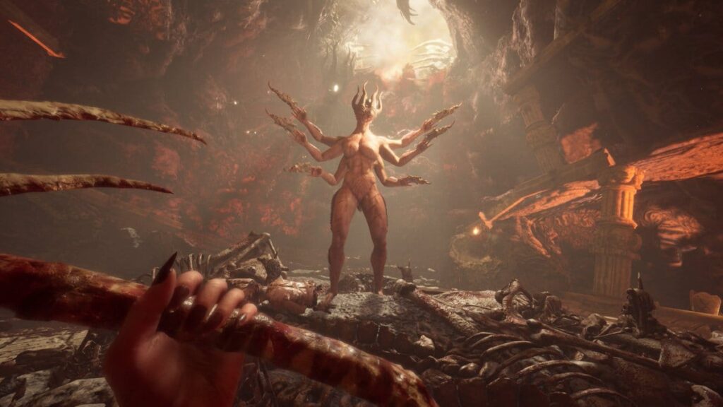 Das Gameplay selbst, ist wie oben kurz angeschnitten aus der Ego-Perspektive, die Charakter Bewegungen sind vergleichbar wie in Agony, jedoch deutlich flüssiger. Ebenso wurden die Animationen stark verbessert, man kann sehen das Madmind Studios Erfahrung gesammelt hat. Mir ist dennoch aufgefallen, dass je nach Untergrund es sich besser oder schlechter laufen lässt. Stellenweise bewegte sich meine Spielfigur so arg langsam, dass die Gegner mich in Sekunden zerfetzten, hier ist die Steuerung teilweise schlampig. Meiner Meinung hat Madmind Studios die Optik der Hölle, sowie auch diverse Spielmechaniken oder Gameplay von einem anderen, sehr bekannten Spiel abgeschaut. Was keinesfalls negativ aufzufassen ist, schließlich ist früher oder später eh alles mal irgendwann, irgendwo, in einem Spiel mal dagewesen.