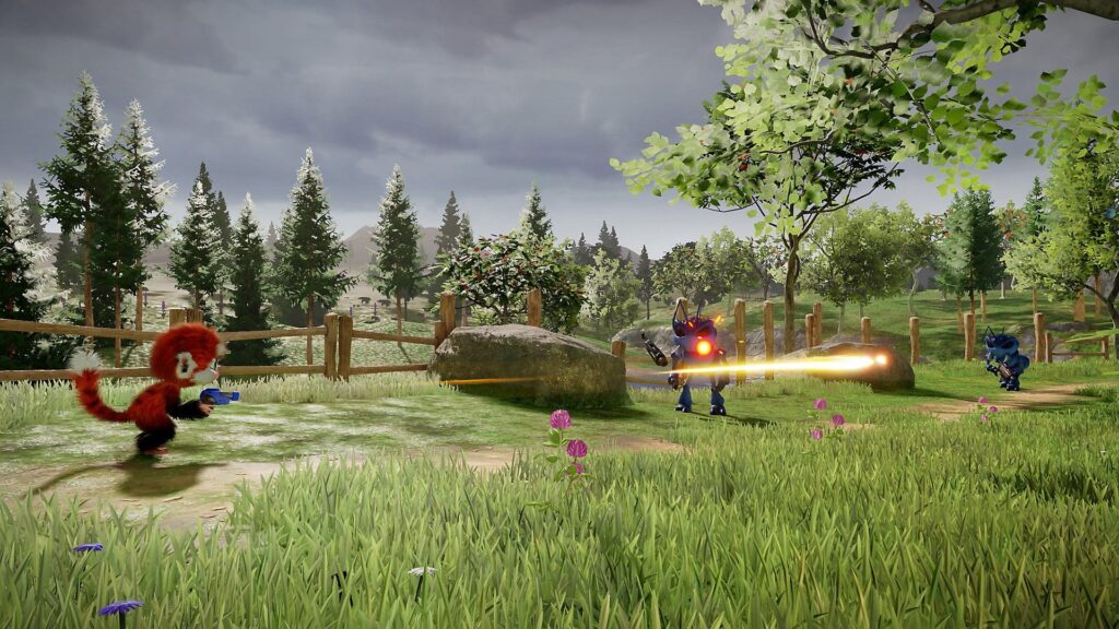 Vor den verkohlten Ruinen unserer ehemaligen Behausung, in dem verwüsteten Tal beginnt das Tutorial. Laufen, springen, Hechtrolle. Alles ganz nett animiert und das Tamarin sieht auch irgenwie ziemlich knuffig aus, will sich mit seinem übertrieben niedlichen Design aber so gar nicht in diese apokalyptische Szenerie einfügen. Nach unseren ersten paar Schritten finden wir aber gleich das erste Glühwürmchen, Tamarins Variante von Super Marios Sternen oder Banjos Honigwaben, ein Portal in den ersten Level und eine deutlich sonnigere Landschaft. Einen kurzen Moment lang hat man das Gefühl jetzt käme das familienfreundliche Spiel, das man vom Titelbildschirm und dem süßen Protagonisten her vermuten sollte und der freundliche Igel, den man dort trifft lässt einen ganz kurz gutes hoffen, bis er dem Tamarin eine Uzi gibt. An diesem Punkt, keine fünf Minuten im Spiel, hatte ich gefühlt eigentlich bereits alles gesehen zu haben, was ich sehen musste. Aber aus einem überzogenen Drang diese Kritik sorgfältig grundieren zu können und vermutlich aus perverser Neugier habe ich noch fünf Stunden lang weiter gespielt und kann guten Gewissens sagen: hätte ich es doch gelassen.