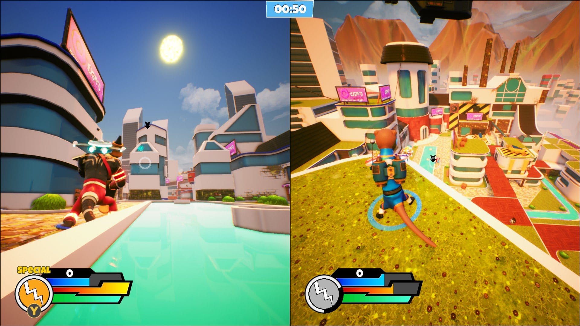 Hat man nun einige Level geschafft, bekommt man auch neue Charaktere, welche alle ihre eigenen Eigenschaften haben. Verschiedene Waffen, eine signifikante Ultimate-Attacke und ein angepasstes Move-Set. Nebenher können auch noch kosmetische Gegenstände freigeschaltet werden, um euren Charakter anzupassen. Besonders der Kampagnen Modus hat im Mehrspieler eine Menge Laune gemacht, obwohl sich die Aufgaben immer öfter wiederholen. Eine Langzeitmotivation ist soweit gegeben, da man in jedem Level das Maximum von 3 Sternen erreichen möchte. Der Versus Modus ist ein klassischer Modus, im Deathmatch Stil, mit Finessen. Hier kann ebenfalls zu Viert gespielt werden, auf Wunsch können dem Deathmatch Modus noch Aufgaben aus der Karriere hinzugefügt werden, um die Spannung noch ein wenig anzuheben. Aktuell kann es nur per Splitscreen lokal gespielt werden, oder am PC via Steam-Remote Play. Doch genau diesen Ansatz wollten die Jungs von Tri-Heart Interactive fördern, zusammen spielen, vor Ort und Spaß haben. Mit dieser Mischung erreichen sie genau das Ziel. Freunde von Story und einer packenden Kampagne schauen klar in die Röhre, doch das ist nicht die Zielgruppe.