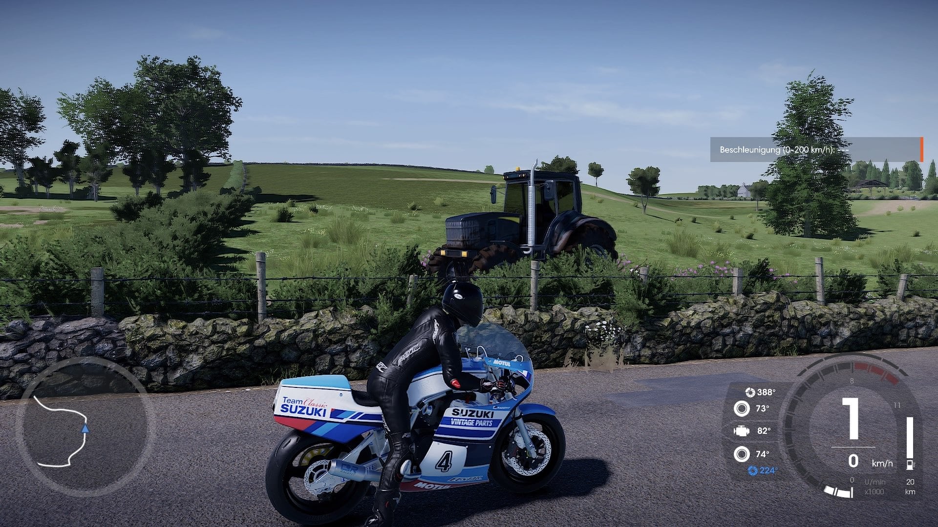 Als passionierter „Motorradfahrer“ und Fan des Isle of Man Rennens, ist es mir eine große Freude ein paar digitale Runden mit dem Motorrad über die Insel zu jagen. Zum Glück durfte ich es nur bei mir Zuhause erleben, denn so oft wie ich in der ersten Stunde vom Motorrad geflogen bin, ich wäre schon locker 100 mal gestorben. Man sollte sich zu Beginn definitiv darauf einstellen, dass man öfters einen Abflug macht. Zum einen liegt es an der empfindlichen, aber doch realistischen Physik Engine. Straßenuntergrund, Bodenwellen, Beschleunigung sowie Reifentemperatur wirken sich extrem auf das Fahrverhalten aus. Zum anderen wollen die Bikes mit Feingefühl geführt werden, also sachte am Gas ziehen, sonst geht’s hinten runter vom Sitz. Nach einer Eingewöhnungsphase und ein paar aktivierten Fahrhilfen bekommt man langsam ein Gefühl für die Maschine.