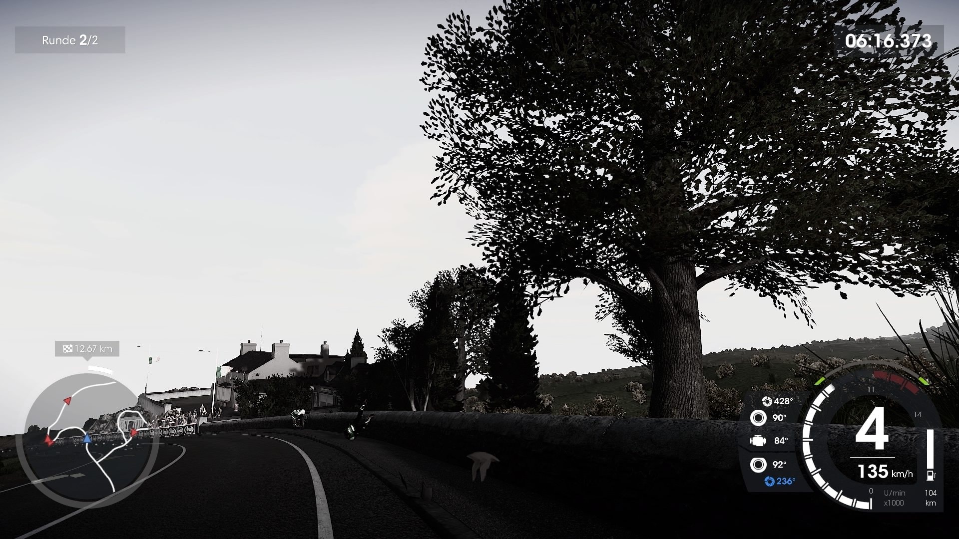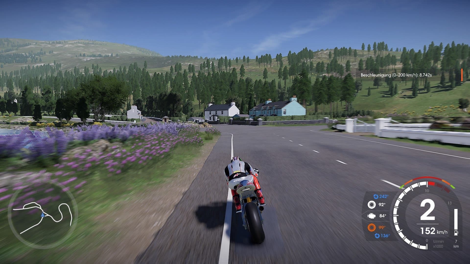 Die Strecken, von denen manche nicht real existieren und extra von den Entwicklern erschaffen wurden, fordern einem volle Konzentration ab. Enge Straßen, mit 90 Grad Kehren sowie Ortschaften mit Bordsteinen und Bodenwellen verzeihen keinen Fehler. Optisch bieten die Ortschaften schon einen gewissen Charme, auch Landschaftstechnisch ist alles sehr schön anzuschauen. Im Rausch der Geschwindigkeit bei 250 Km/h hat man natürlich kaum ein Auge dafür, jedoch bin ich auch ein paar mal langsamer gefahren um die Landschaft zu bewundern. Überall gibt es Details zu erkennen, geparkte Autos in den Einfahrten, Schafe auf der Wiese oder einfach die irische Nationalflagge im Vorgarten eines Hauses. Es handelt sich hier keinesfalls um absolute eine High-End Darstellungen, jedoch ist das ganze nicht sonderlich unansehnlich. Deutlich schwieriger ist es da schon mit den Bäumen, bei Hochgeschwindigkeit laden die Texturen in der Ferne leider manchmal erst spät und alles wirkt sehr kantig. Hingegen wirkt der Geschwindigkeitsrausch auf dem Motorrad sehr realistisch, sodass einem manchmal die Textur Ladehänger nicht direkt auffallen.
