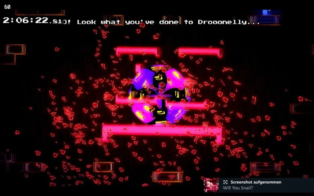Optisch ist Will You Snail ansprechend gestaltet mit seinen Neon farbigen Ambiente und den vielen Paralaxen Szenen. Der Soundtrack ist absolut eingänglich und wirkt nie nervig, wer will, kann ihn sich auch auf Spotify anhören. Was jedoch ein wenig anstrengend sein kann, sind manche Passagen, wo sehr viele Farben und Effekte auf dem Bildschirm auftauchen, gerade Epileptiker könnten hier Probleme bekommen, jedoch wurde das im Intro des Spiels lobenswerterweise auch erwähnt. Im großen und Ganzen kann Will You Snail einen für eine längere Zeit beschäftigen, sofern man alle Geheimnisse finden möchte. An die Speedrunner Community wurde auch gedacht, es gibt einen Timer, welcher einem in den Runs begleitet. Das Komplettpaket an Optionen ist so umfangreich, dass ich hier nicht alle aufzählen möchte, jedoch kann sich jeder das Spiel anpassen, dass es einem auch Spaß macht. Jonas Tyroler hat mit Will You Snail viele Einflüsse aus seiner Community in das Spiel einfließen lassen, herausgekommen ist ein humoristisches aber doch sehr forderndes Spiel, was mir einige graue Haare mehr gebracht hat.![]()